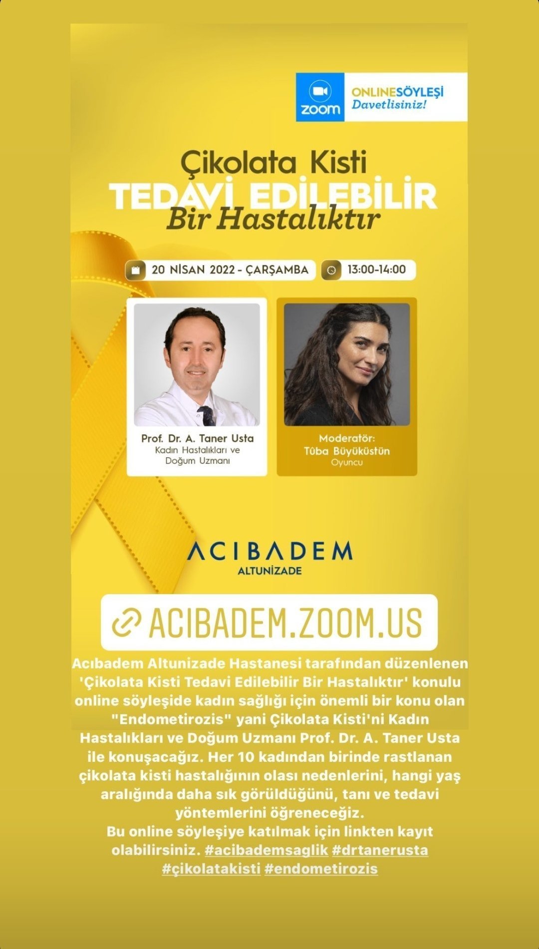 Туба добави в стори. На 20.4.2022 от 13 до 14 ч. ще участва в онлайн интервю "шоколадовата киста е лечимо заболяване", организирано от болница Acıbadem Altunizade.