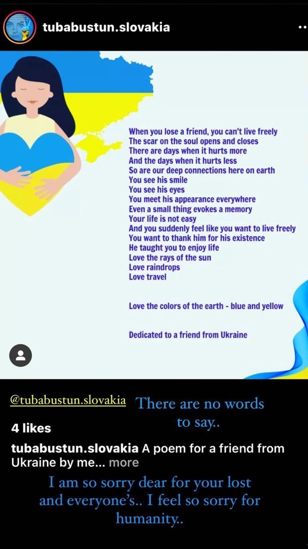 Туба ответила: tubabustun.slovakia, Нет слов, чтобы выразить.. Мне так жаль, дорогая, за твою потерю и потерю всех остальных.. Мне очень жаль человечество..