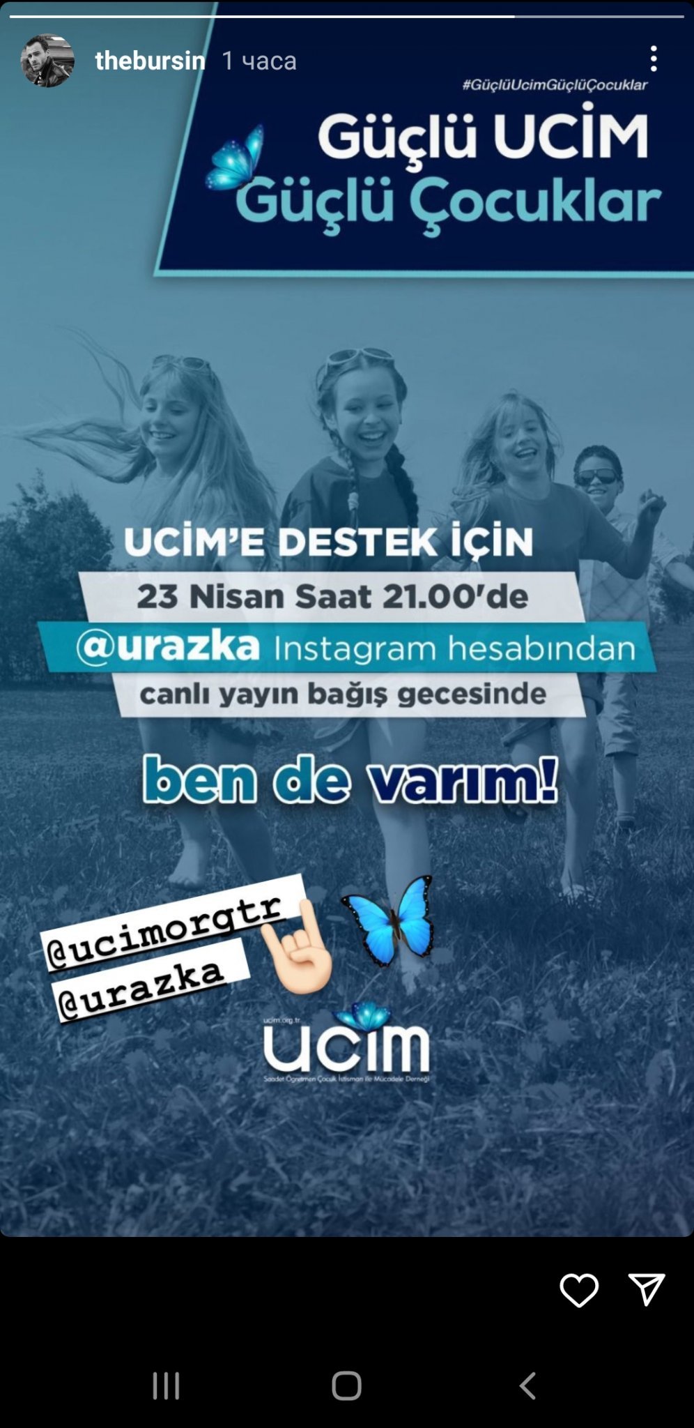 Благотворителен лайф от профила на Ураз в Инстаграмза набиране на средства за тази организация UCİM ,която се занимава с превенция на насилието върху деца и работи с жертви на такова насилие.
