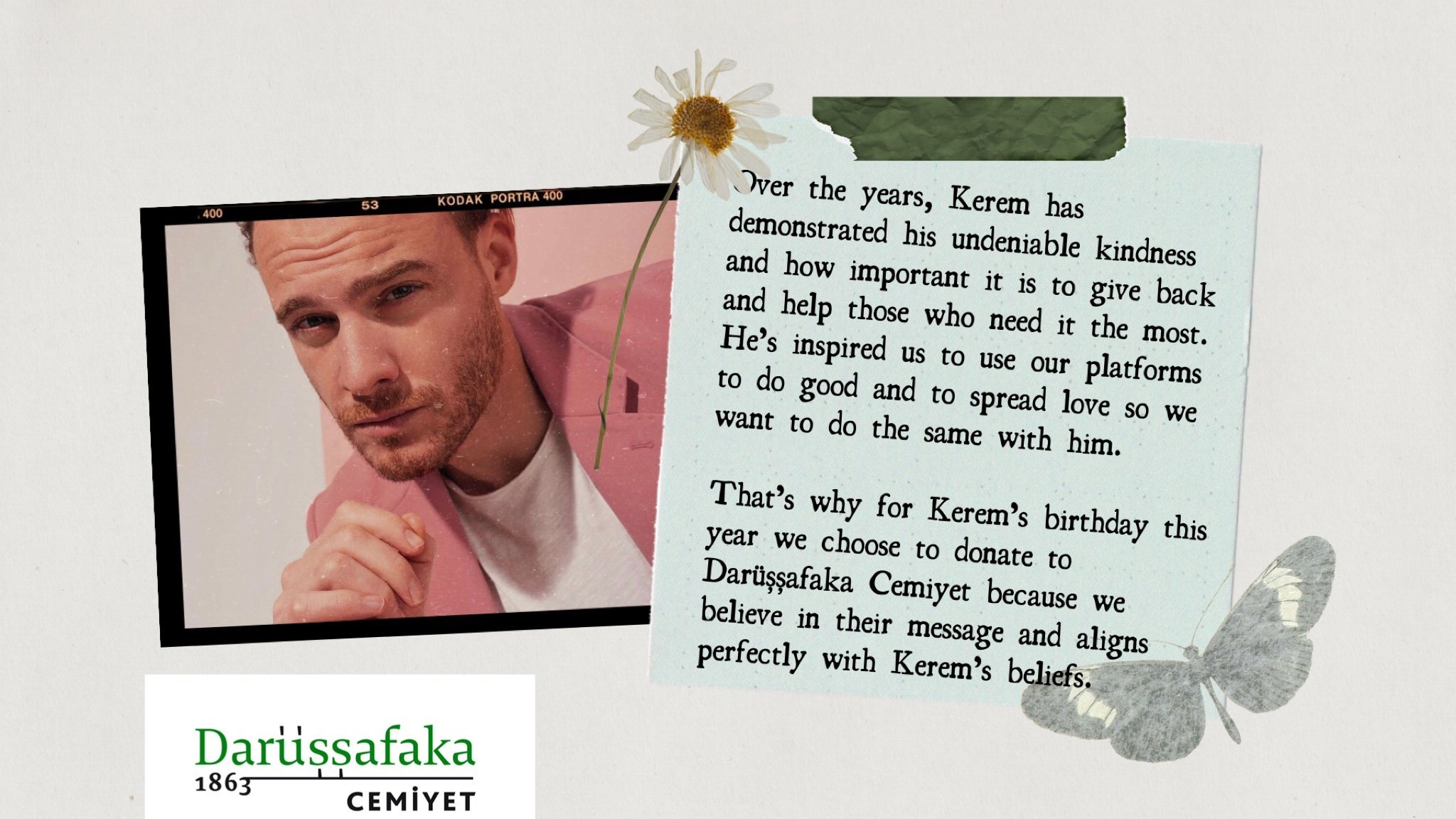Тази година избрахме Darussafaka Society, защото вярваме в тяхното послание и съвпадаме перфектно с вярванията на Керем. Каним всички фенове на Керем и всеки, който иска да се присъедини към нас, да участват по всякакъв начин, за да помогнат на тази невероятна кауза. Вашият принос ще помогне да се даде възможност на деца, които нямат родители, да получат образование.