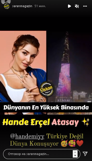 Образът на Ханде Ерчел беше на най високия небостъргач в света Бурж Халифа в Дубай,по повод 85г.на марката за бижута Атасай на която тя е лице.