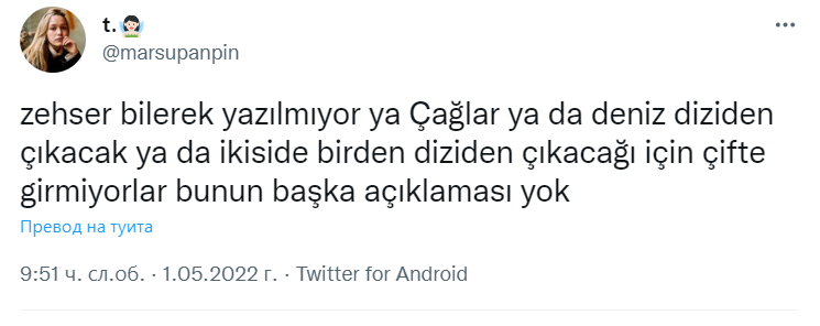 Разбира се, че не очаквам да се оженят и народят бебета, но може да виждаме друго освен благодаря и аз те разбирам....все едно и също. Последно имахме нормална сцена в 39еп. с колието. Значи когато искат могад да пишат хубави и различни сцени. Сега сме 45еп. и едва ги виждаме един до друг, дори на операции вече не ходят заедно. В първи сезон казвахме, че ги пазят за 2ри. Сега пък от 2ри ги пазят за 3ти... Дори Чаалар намекна, че нямат сцени, когато пусна онова селфи с надпис -срещнахме се на сета след много време.