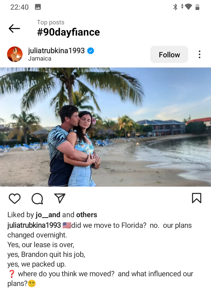 Брандън и Юлия планирали да се преместят във Флорида, той напуснал работа, освободили си жилището, приготвили си багажа и се отказали. Явно все пак са си харесали ново място: