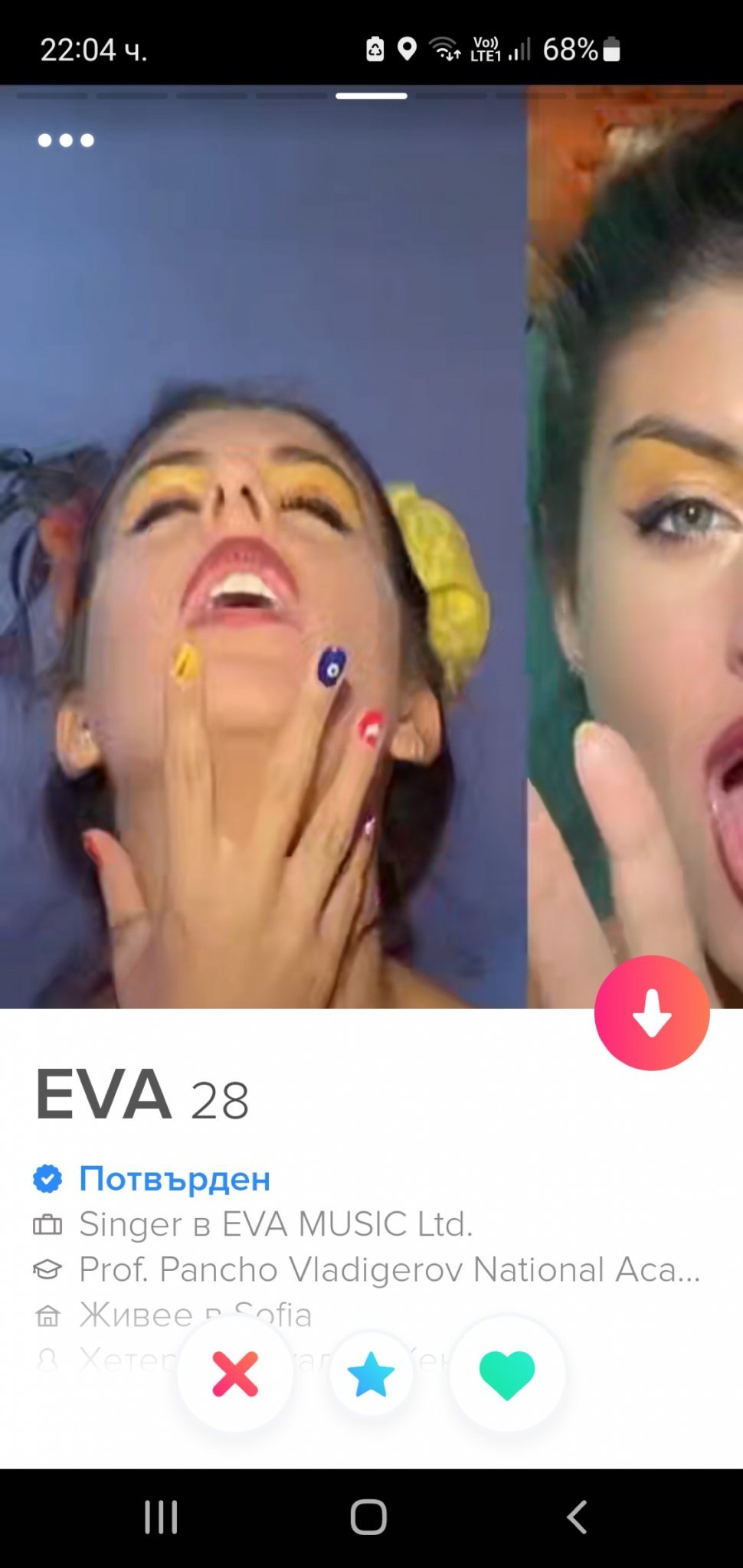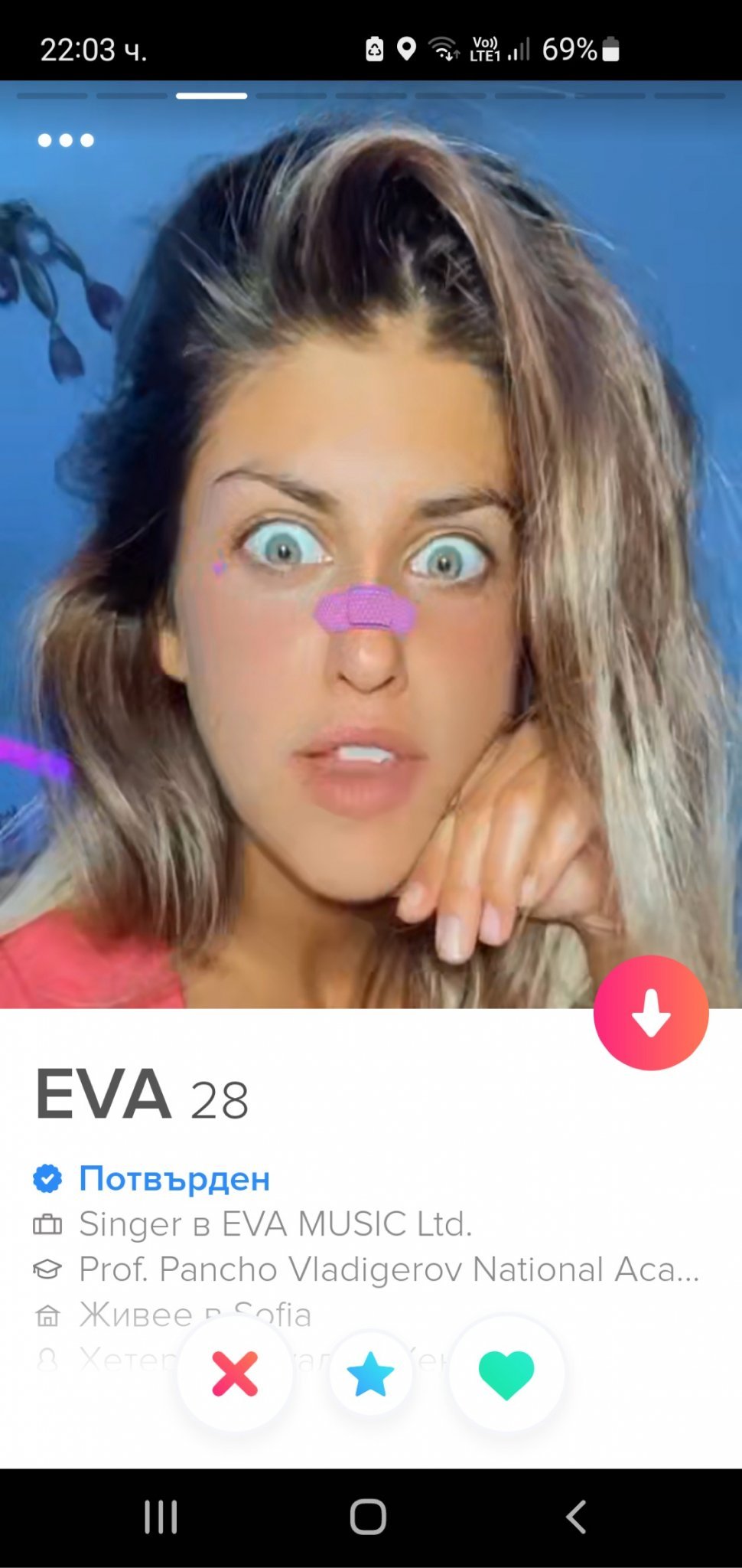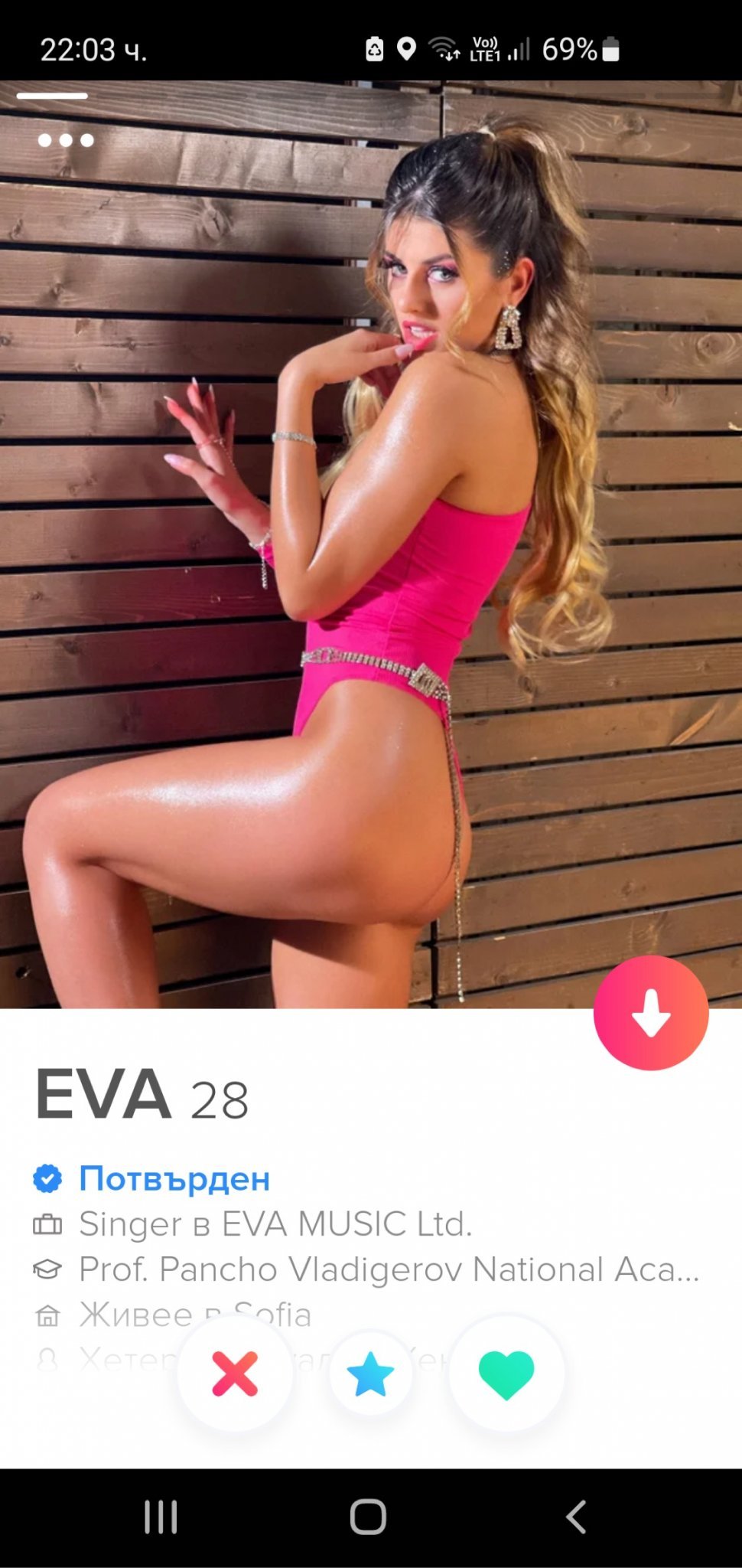 Не знам колко е тя. Аз не съм популярна личност, но скоро оставих, че мои снимки се въртят в Тиндър.. Ева е сгодена и знам, че ще вдига сватба, едва ли ще се развява из Тиндър така, плюс че е разпознаваема.