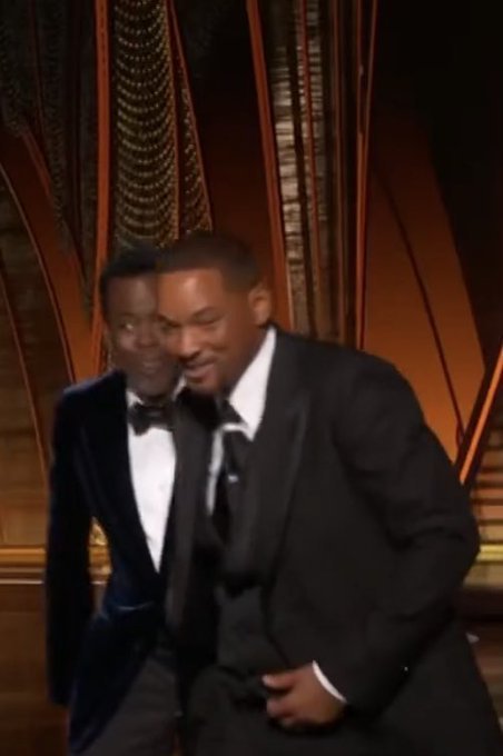Вижте му лицето, така ли изглежда човек който е истински бесен само преди миг за да шамароса Крис Рок. По скоро така изглежда човек който знае че играе роля и в адреналина от изпълнението, не успява в мига след шамара да продължи да бъде ядосан. Simple Smile После успява да се овладее и си изиграва ролята перфектно.