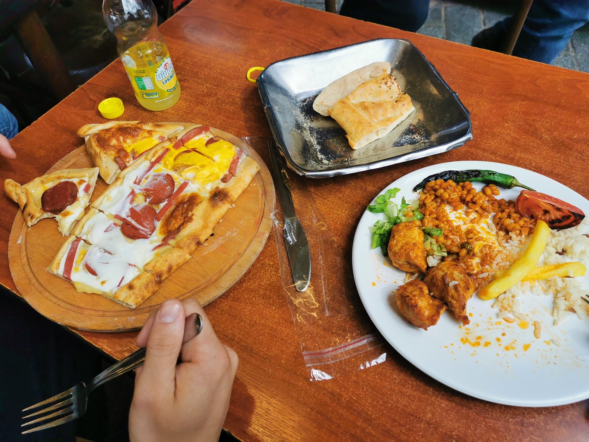 Като слязохме от корабчето, точно срещу трамвайната спирка имаше едно заведение пълно с хора и мкслехме да хапнем там, пиде с яйце, салам и кашкавал беше 50/55 лири, пилешко на скара с ориз и малко салатка отстрани беше 60 лири. Решихме да проверим в съседните заведения в посока египетския пазар, но колкото по-навътре в уличката влизахме, толкова по-високи ставаха цените и накрая се върнахме и седнахме в първото. Хареса ни всичко. Не сме претенциозни. Tatseven се казва заведението. Видяхме такова и на други места впоследствие. Не ни донесоха безплатна вода, но беше вкусно.