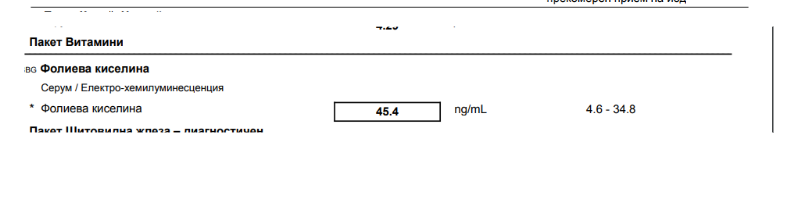 Здравейте, момичета. Това изследване е от 10 гс и фолиевата е над норма. Дотогава приемах Топфолат 1 т. дневно. На на своя глава я спрях за около седмица. В последствие получих коментар за изследванията ми , но този резултат не беше коментиран. Предписаха ми Б комплекс в който има фолиева, затова спрях Топфолата. Дали е ок така и вие ако сте имали над норма как сте процедирали? Благодаря!