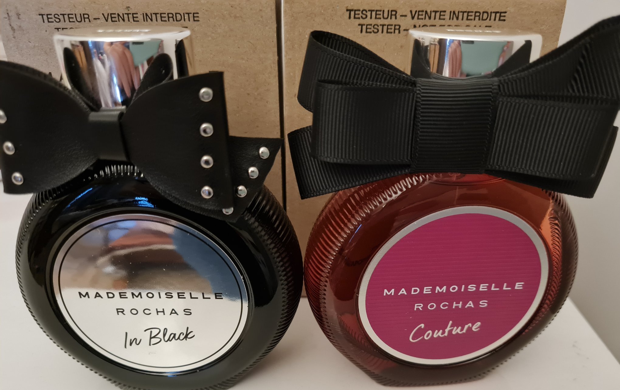 Tестерите на Rochas са с капачки и панделки, въпреки че на картинките в Парфимо (чешкото) са без.