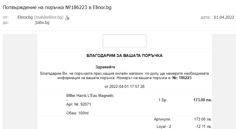 Аз съм в потрес Grinning На 1 април имам поръчка от Елинор, но явно е била първоаприлска шега, защото днес, десет дни след поръчката нямам никакви индикации за движението на този Милър Харис (освен "Поръчката ви е в процес на обработка. "), но пък ми пристига имейл за оценя обслужването на Елинор във връзка с тази поръчка.