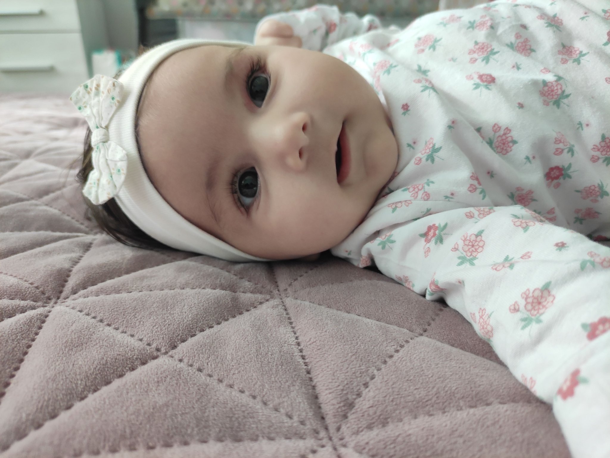 Преди 2 дни беше 6.800кг (родена е на 30.01), бузанка е, много яде и все по-малко иска да спи. За радост лесно заспива в количката. 😁