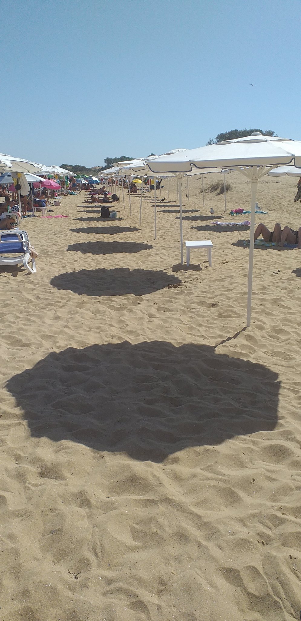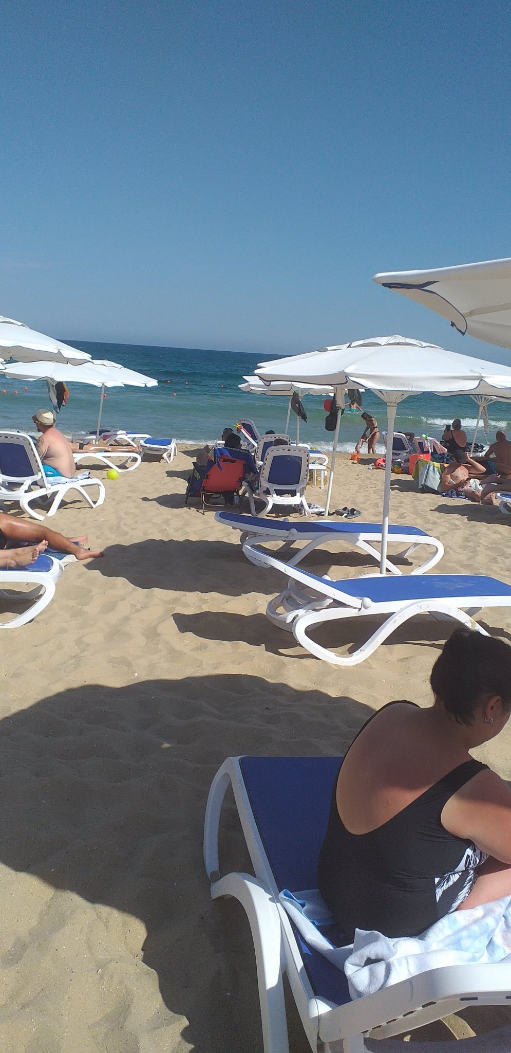 В момента сме на Южния плаж под дюната.  Водата е чиста, флагът е червен, последен и предпоследен ред чадъри са почти свободни. Хората са ОК около нас.