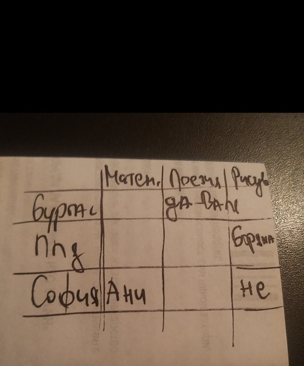 Благодаря, че отговорихте! Самите отговори ги има в сборника, но учителката изисква нагледно да се представи в таблица, за да се види решение. Пробвах разни варианти, но не можах да се ориентирам как да се представи