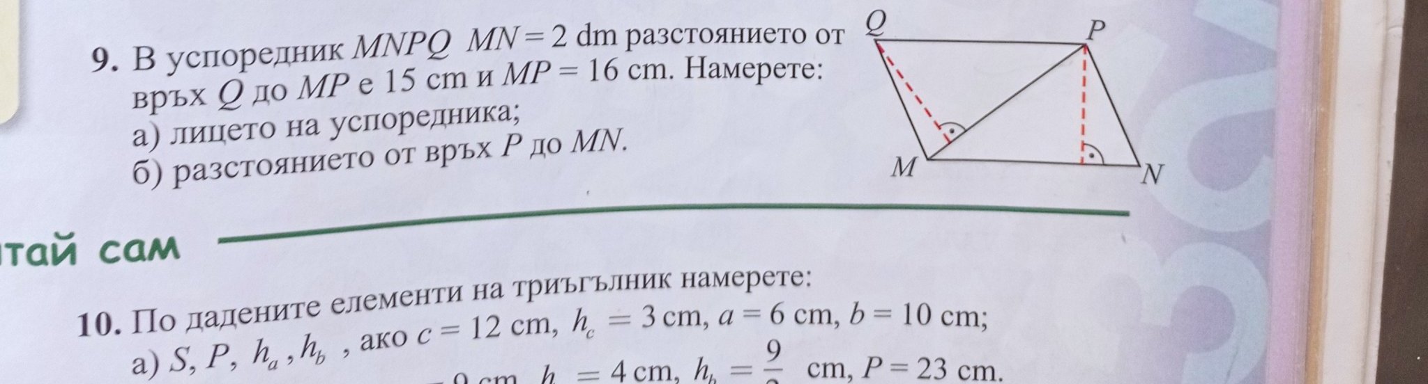 Намирате лицето на MPQ - имате страна и височина към нея. Триъгълниците MPQ и MNP са еднакви, значи имат равни лица. Лицето на успоредника е 2 пъти лицето на MPQ.