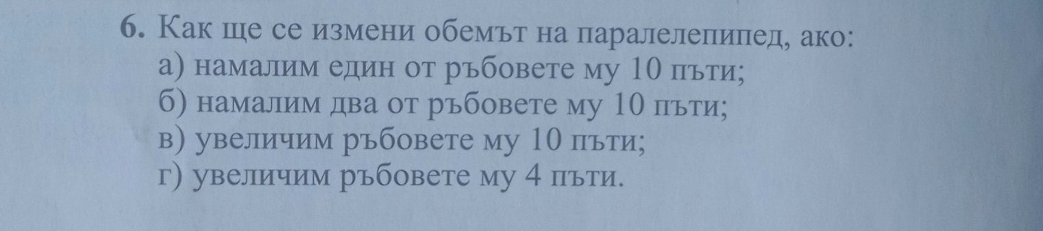 Нека ръбовете са a, b, c. Обемът е V=a. b. c