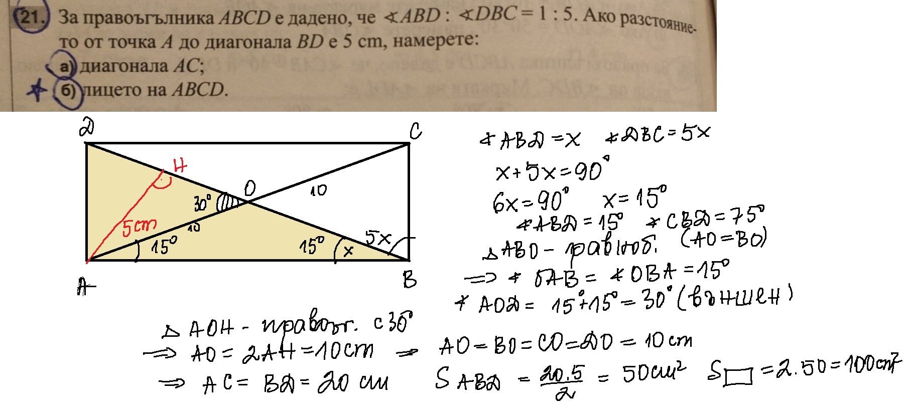 Skip.id, със знания за кой клас трябва да се реши задачата? Защото ако сте намерили единия диагонал, то знаейки че диагоналите в правоъгълника са равни, ви остава само да умножите по 5...