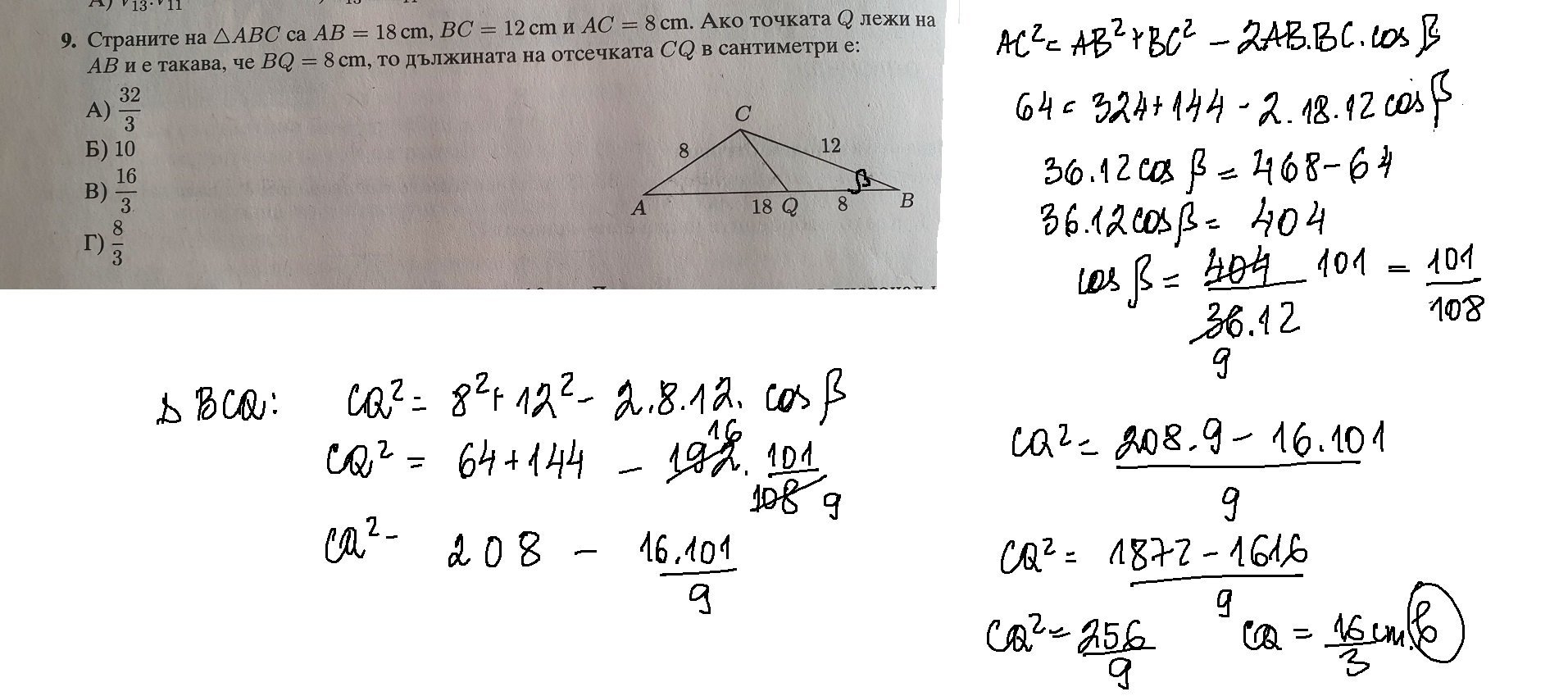 Задачата е за подготовка за 10класни матури и аз не успявам да се ориентирам за посоката на мислене... пробвах с косинусова теорема, ама става доста сложно, а и не ми излиза отговорът Disappointed
