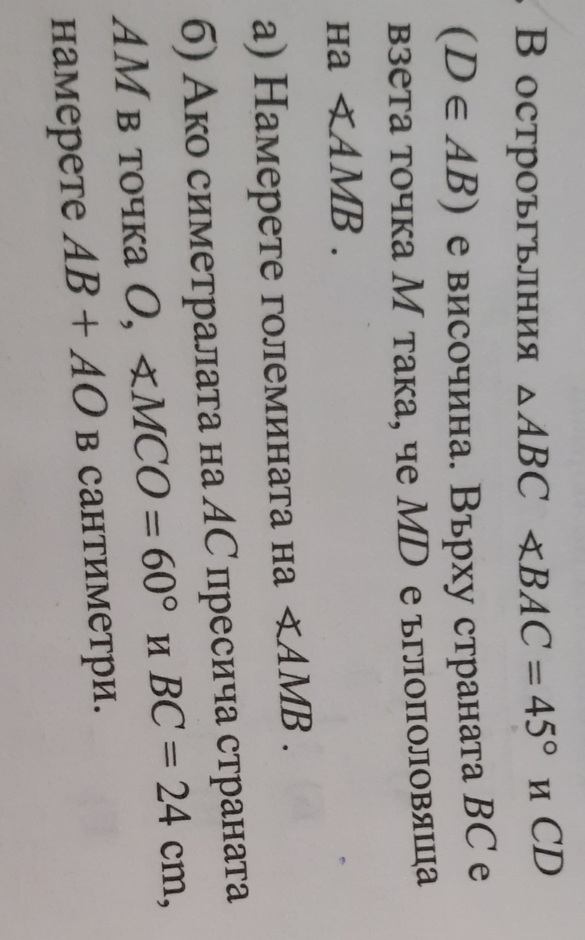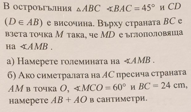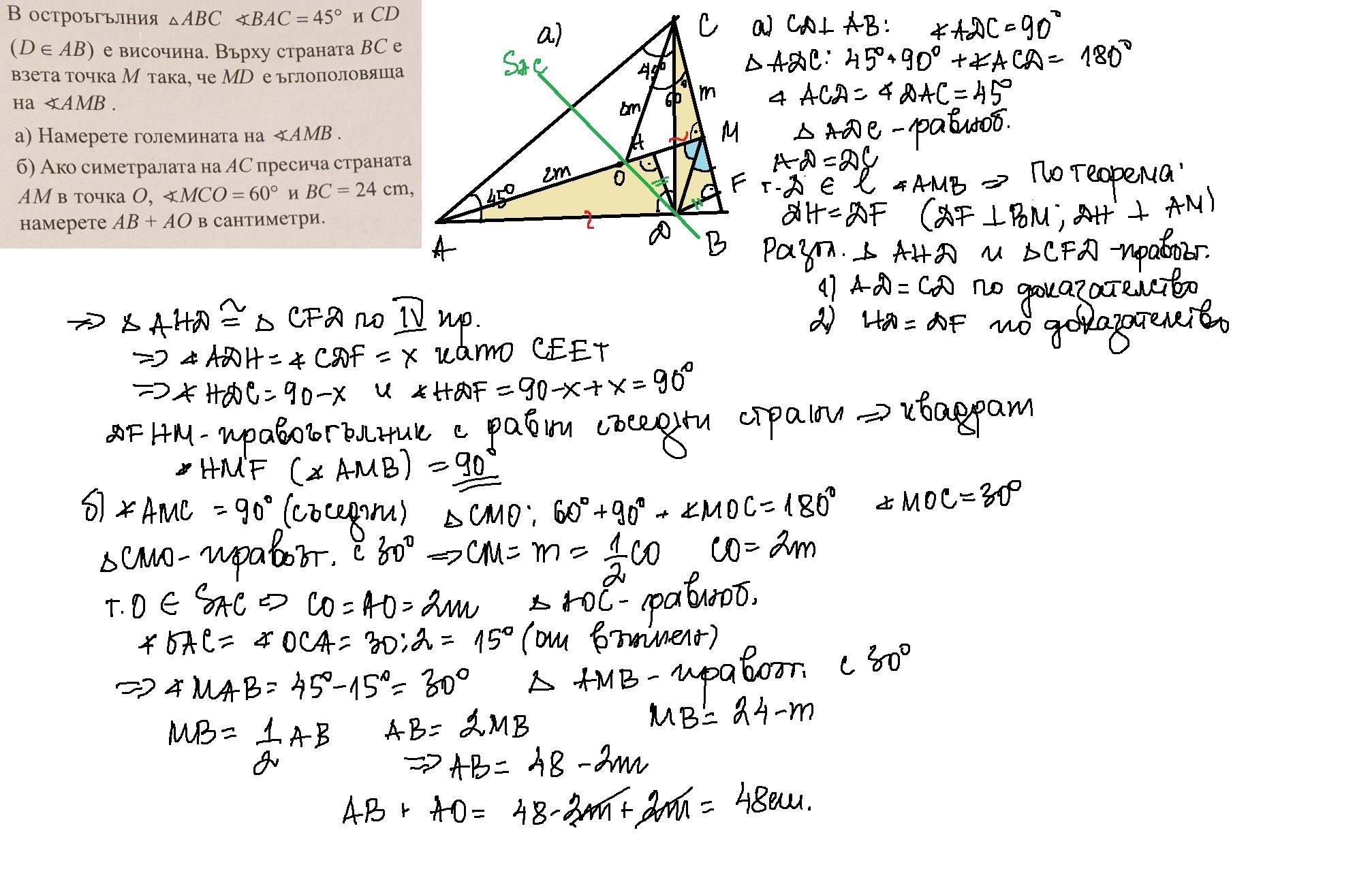 Ъгъл САМ=45-х, ъгъл АСМ=45+х, АМС=180-45+х-45-х=90,. Ъгъл АМВ=90.