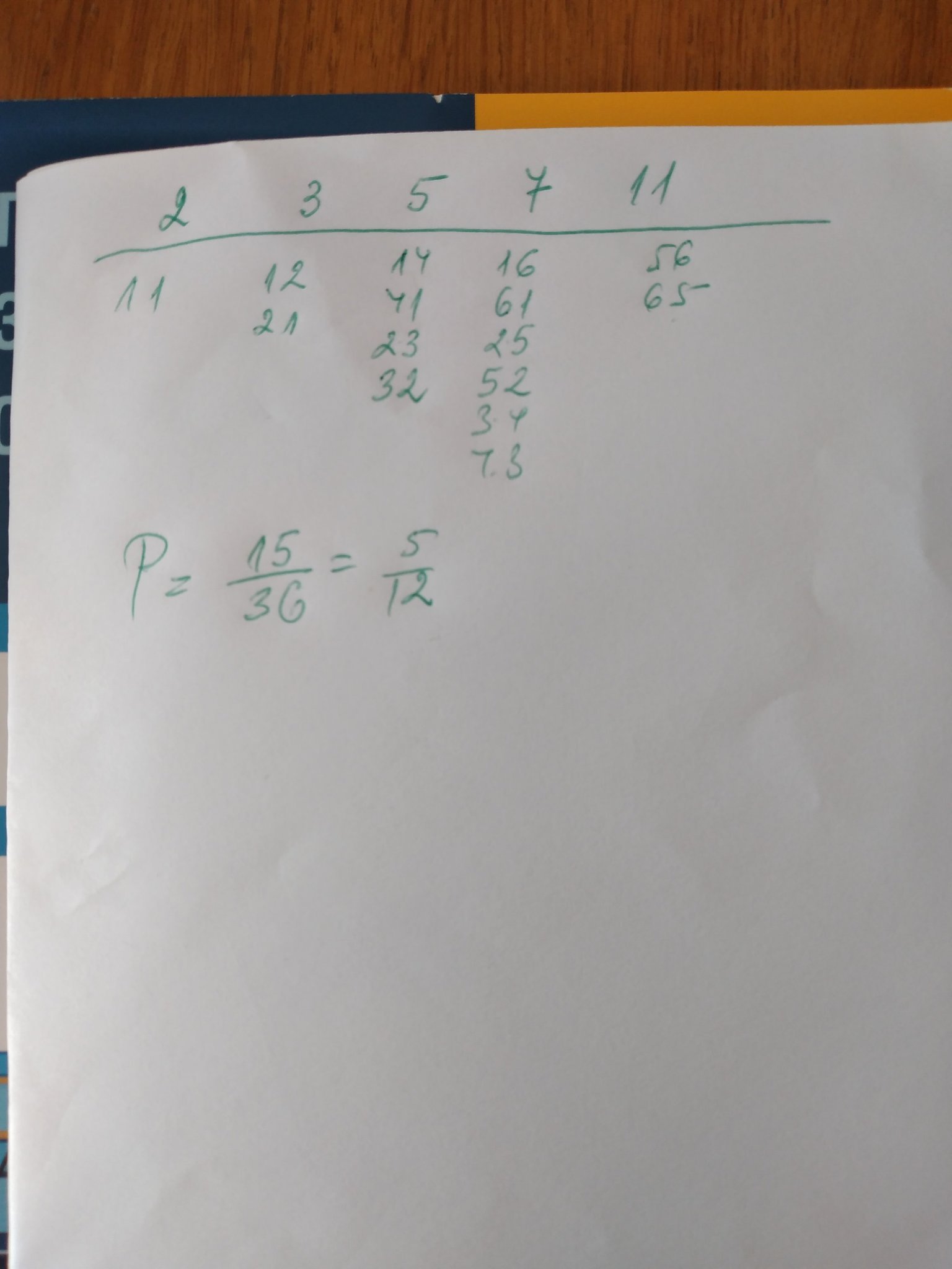 Хвърлят се два 6-стенни зара. Вероятността сборът от падналите се точки да е просто число е: