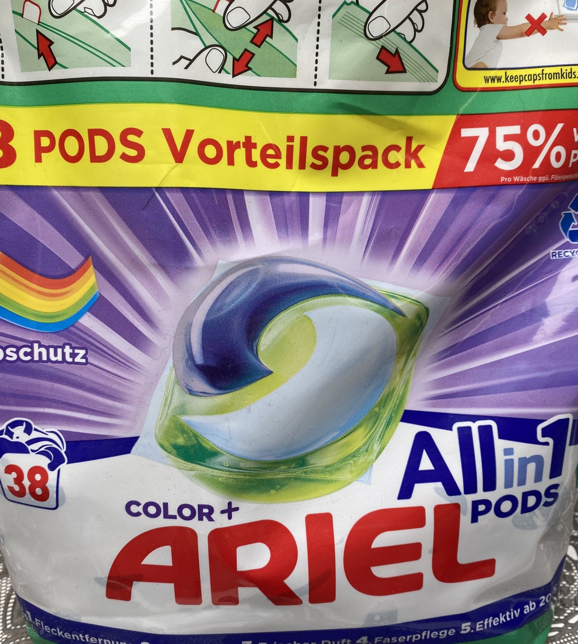 За пране купувам от тези на снимката, за бяло и за цветно. Три такива пакета в кашон струват 16-17 евро. Значи по 114 капсули от вид, по две на пране слагам и не знам колко месеци ги ползвам. Омекотители не купувам, но те са по около евро.