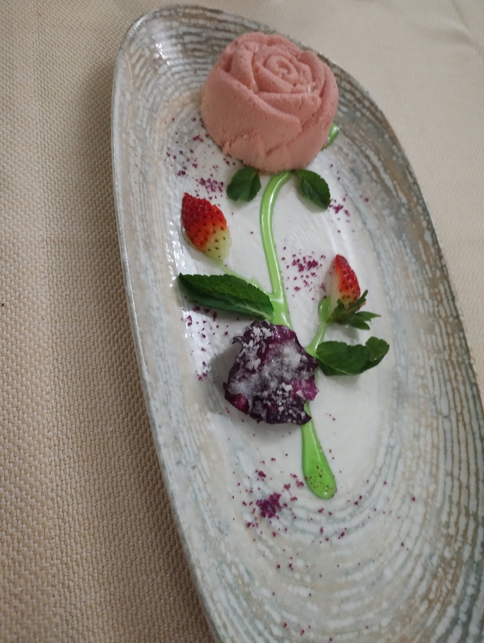 Заведе ме на ресторант. Това е роза от бял шоколад, листенцата са захаросани розови листенца, и мента. Изненада ме, обаче като се върнахме, свекървата решила да дойде у нас, страх я боли от земетресения. Беше поела инициатива да готви?? Още смърди у нас на мас и не зная още какво.