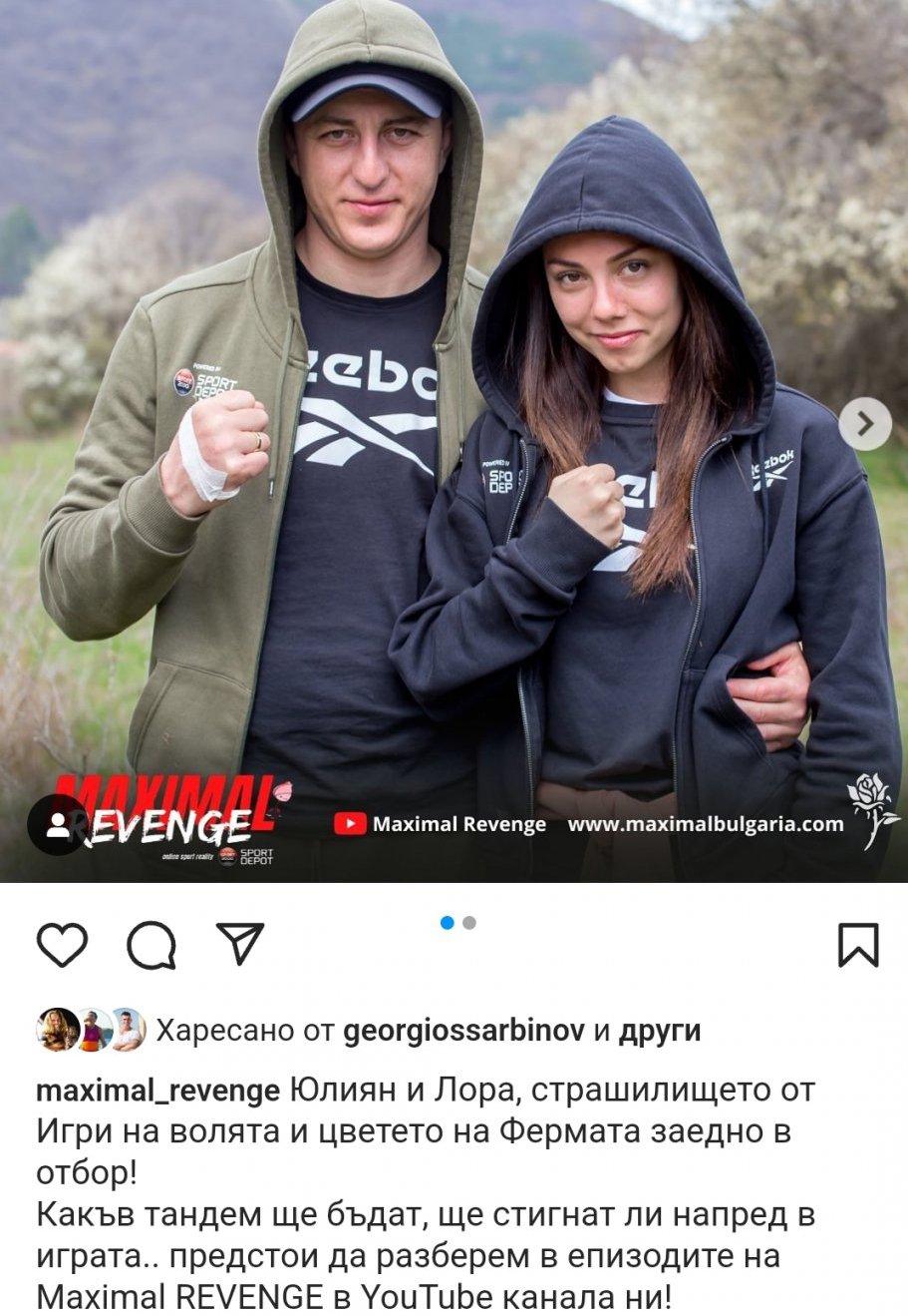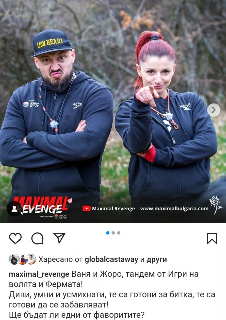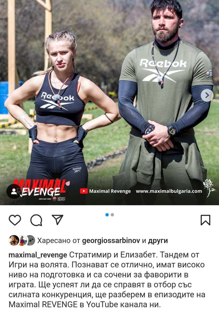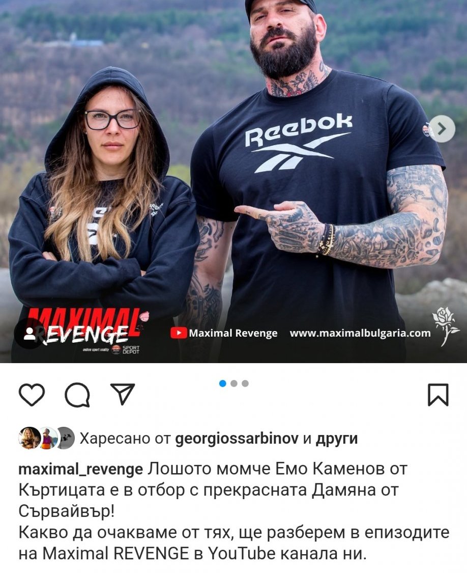 вицешампиони от “Един за друг” 2020г. Единствената обявена двойка в новия сезон на MAXIMAL REVENGE. Забавни, непредсказуеми и в страхотна спортна форма. Готови за битка срещу останалите риалити герои, те влизат в състезанието, за да достигнат до финала с настроение и решителност.