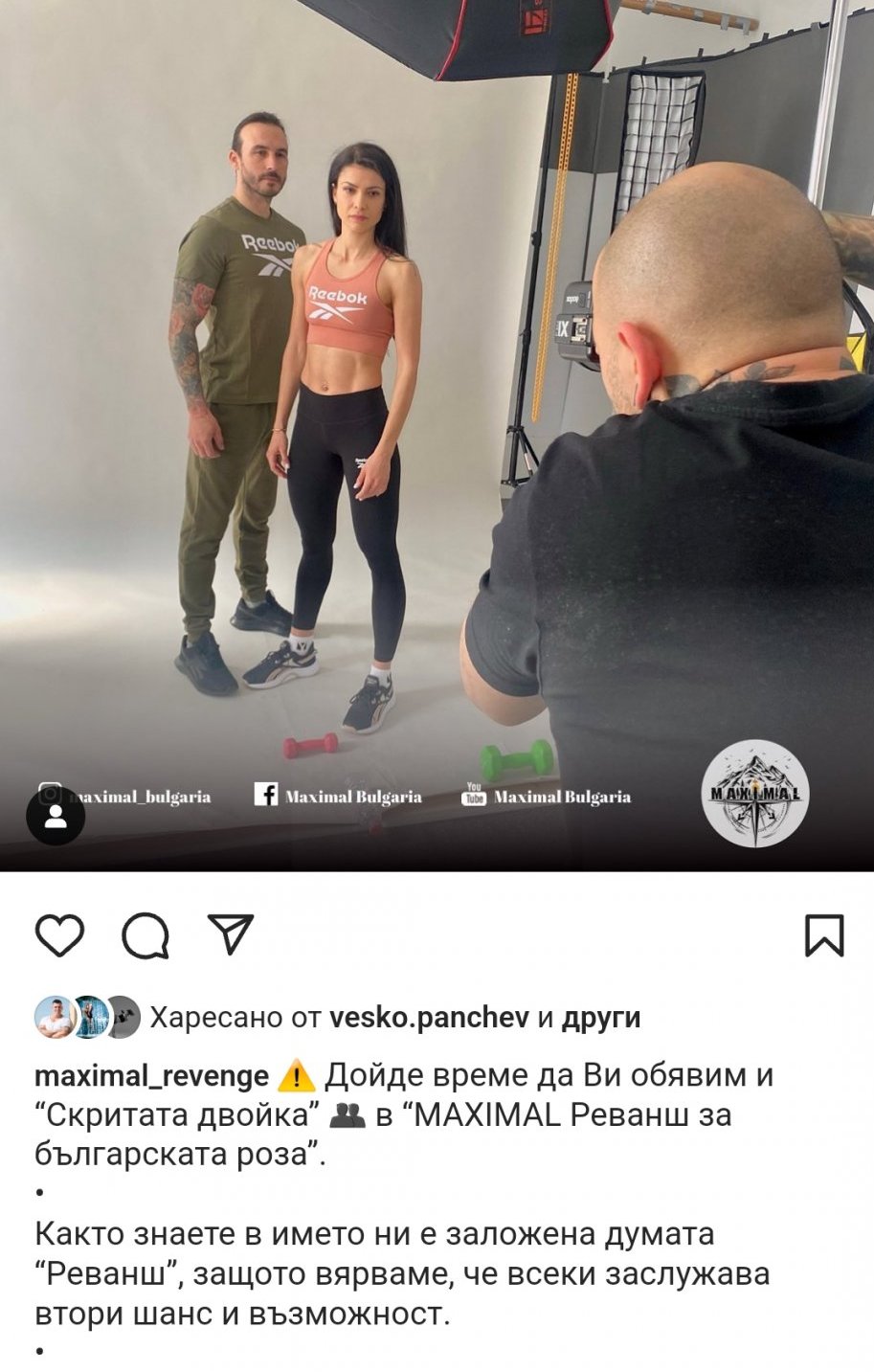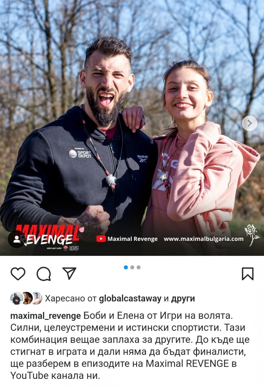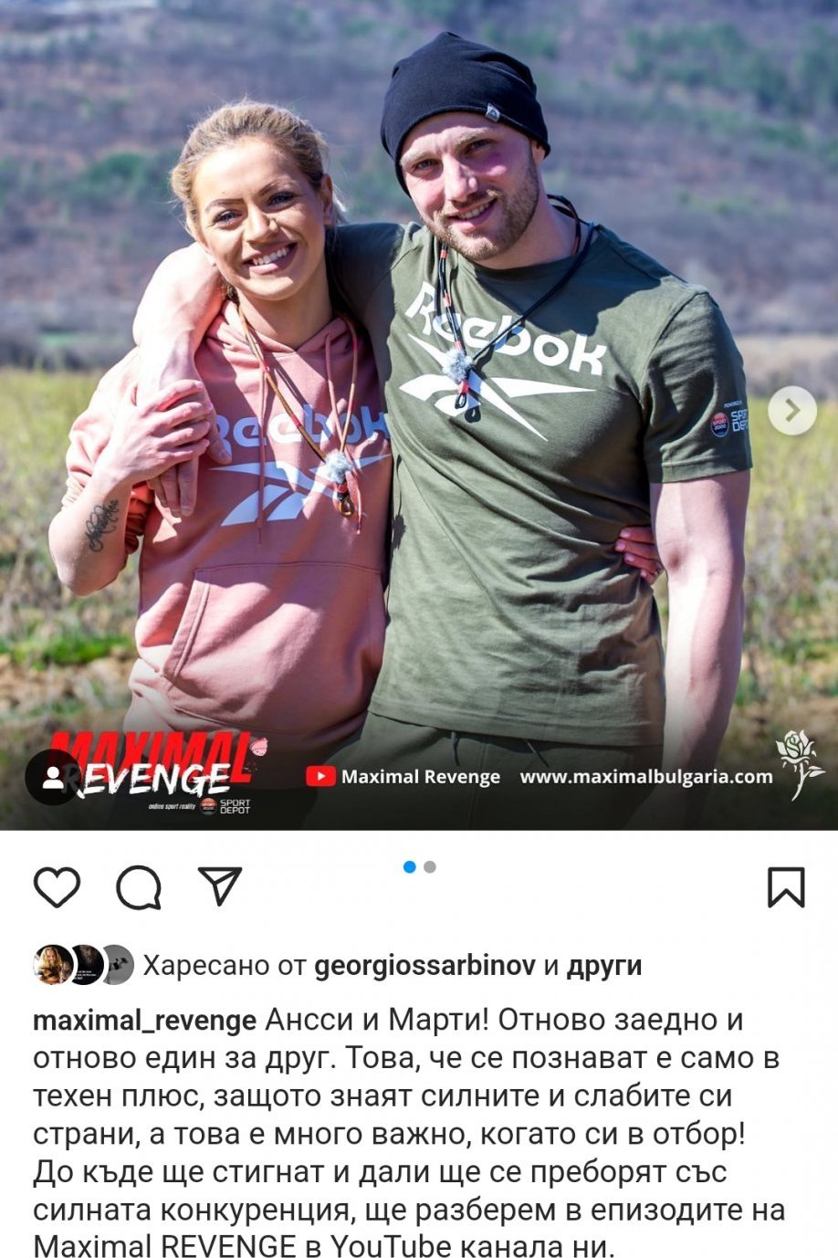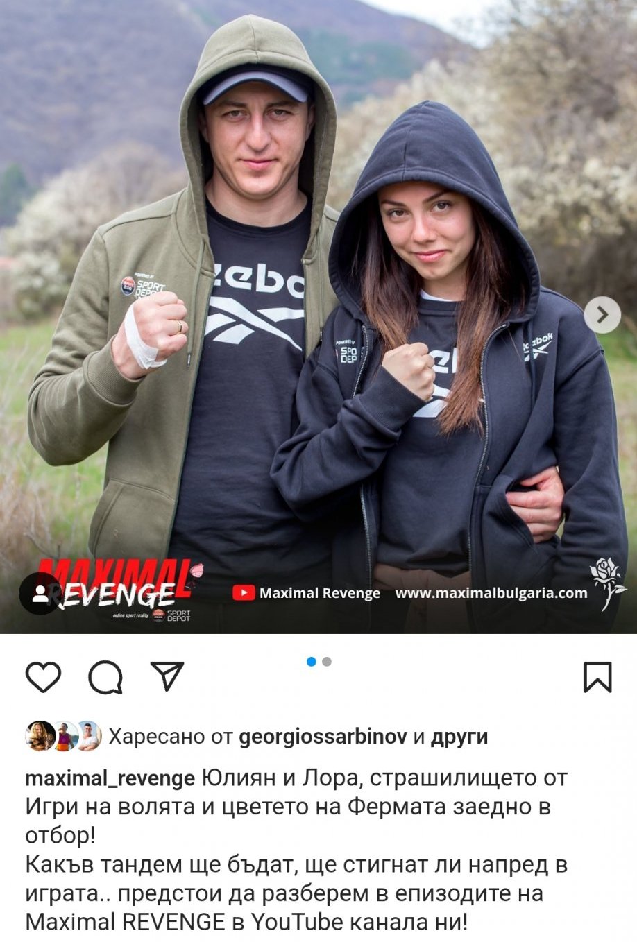 вицешампиони от “Един за друг” 2020г. Единствената обявена двойка в новия сезон на MAXIMAL REVENGE. Забавни, непредсказуеми и в страхотна спортна форма. Готови за битка срещу останалите риалити герои, те влизат в състезанието, за да достигнат до финала с настроение и решителност.