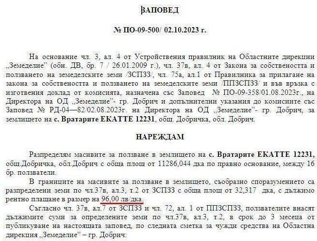 Имам 30 дка земеделска земя в с. Вратарите, обл. Добрич, 4 категория, имаме сключен договор с фирма и взимам за година средно 1500–2400 лв, като тази година ще взема към 1500 лв .