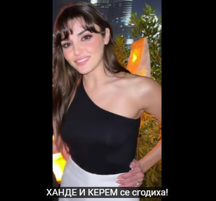 Silvia Toffanin от VERISSIMO е писала :  "Hande Erçel è fidanzata con l'attore turco Kerem Bürsin" - "Ханде Ерчел е сгодена за турския актьор Керем Бюрсин" .