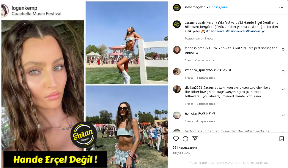 На тази снимка-опровержение е написал: "Не е Ханде Ерчел на фестивала в Америка, просто се откажете от навика да докладвате всичко, което виждате, без да го знаете."