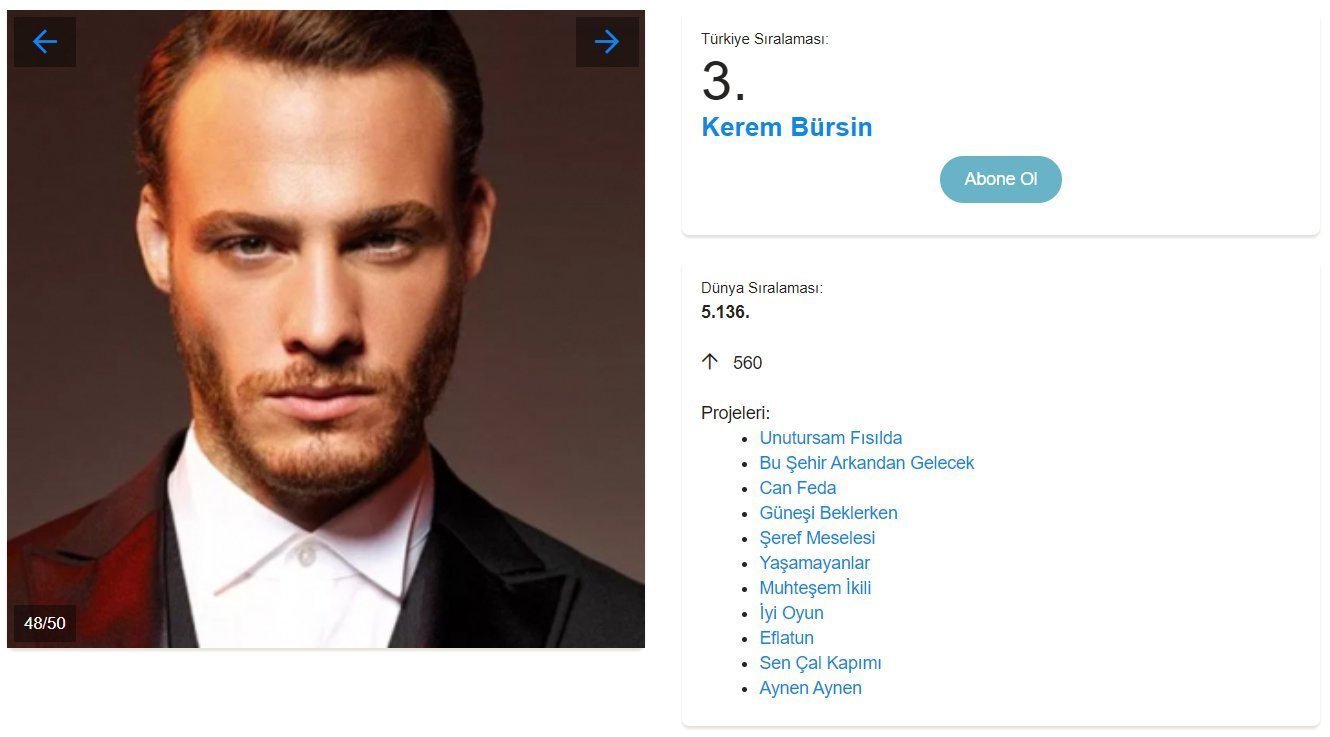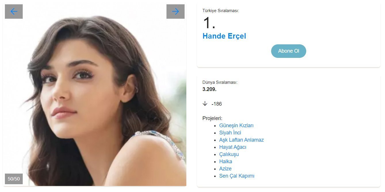Ханде Ерсел отново оглавява класацията на IMDB сред турските актьори и актриси според @socipol. И е на 3209 място от 11 милиона актьори/актриси по света.