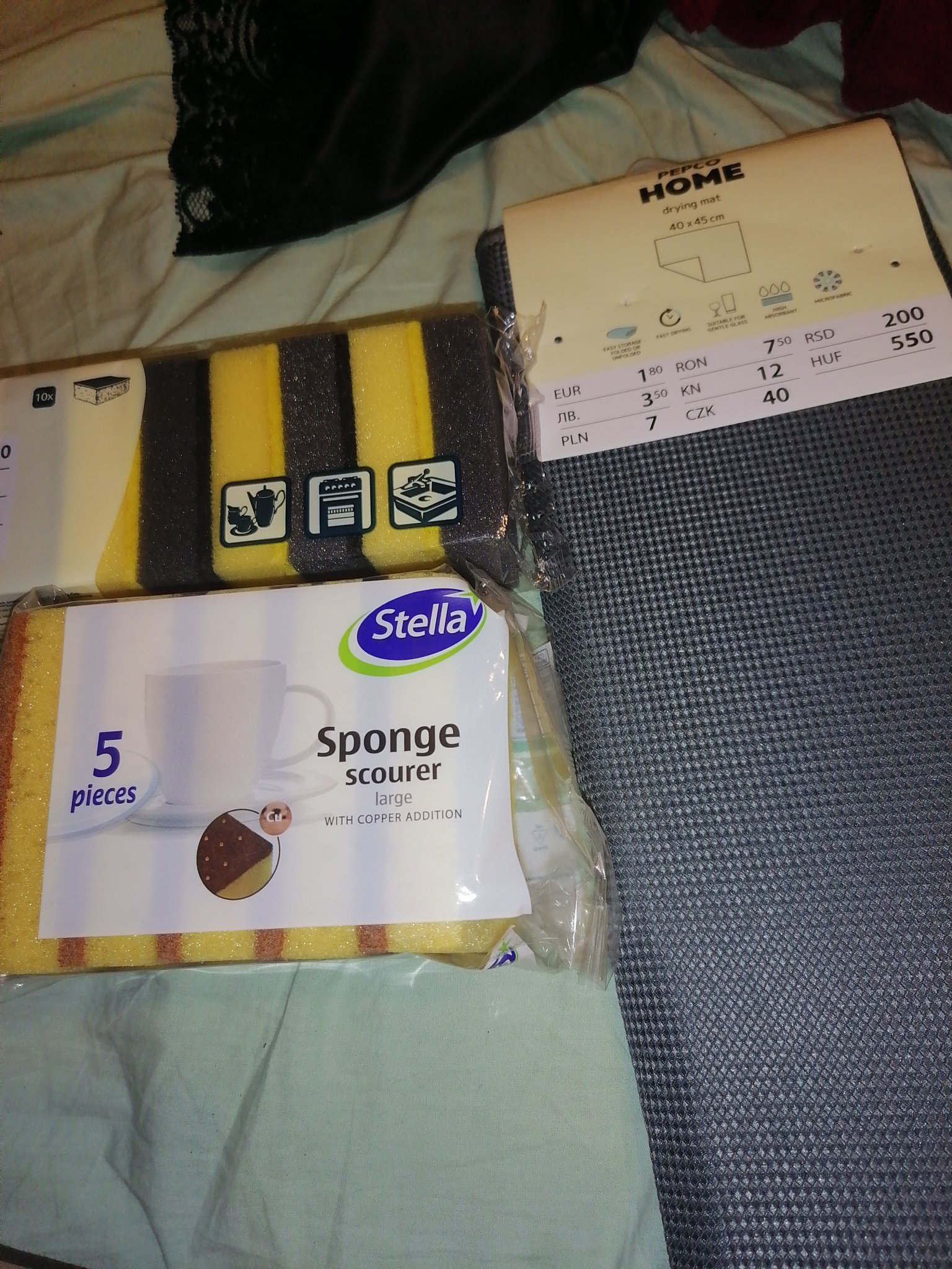Аз вчера взех принадлежности за офиса - торби за смет , метла , за вкъщи - млековарка и една тенджера ,както и постелка за пред баня.