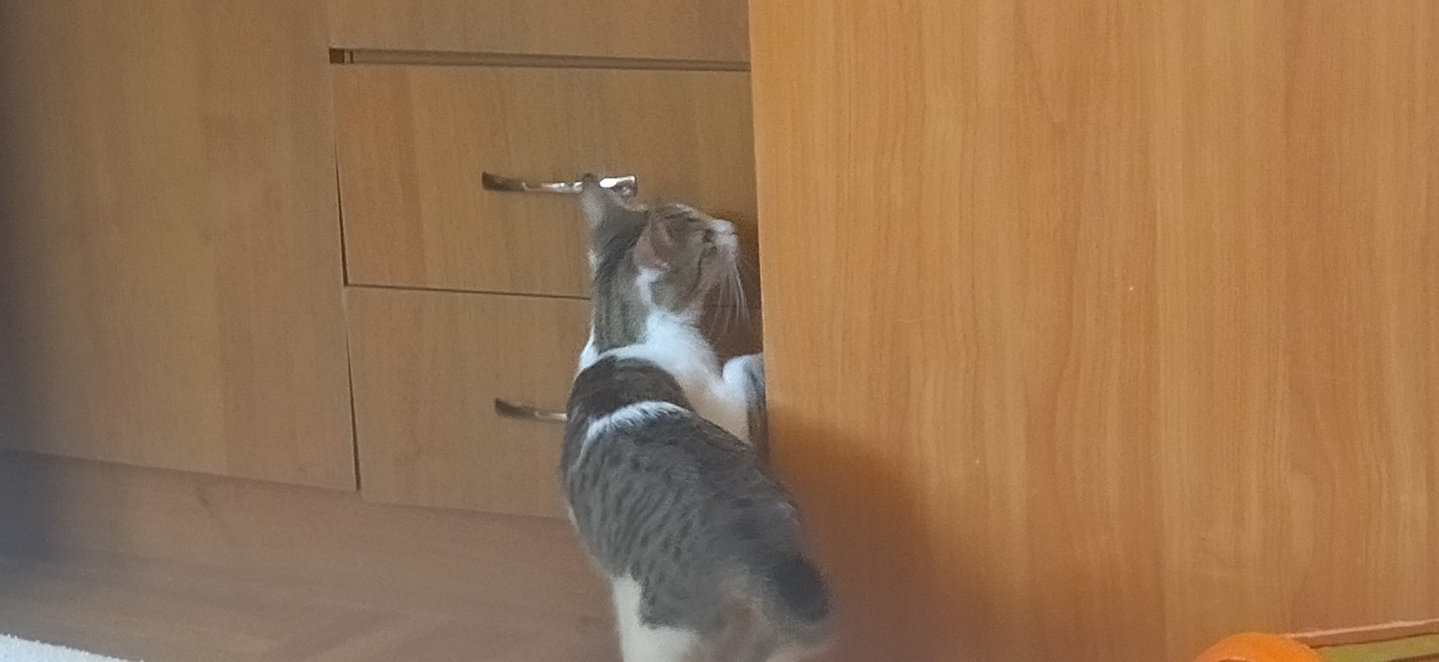 Нашата дращи по вратите, да видим колко ще издържат. Дори и в гардероба много иска да се намъкне. Дрехите ще ми избира