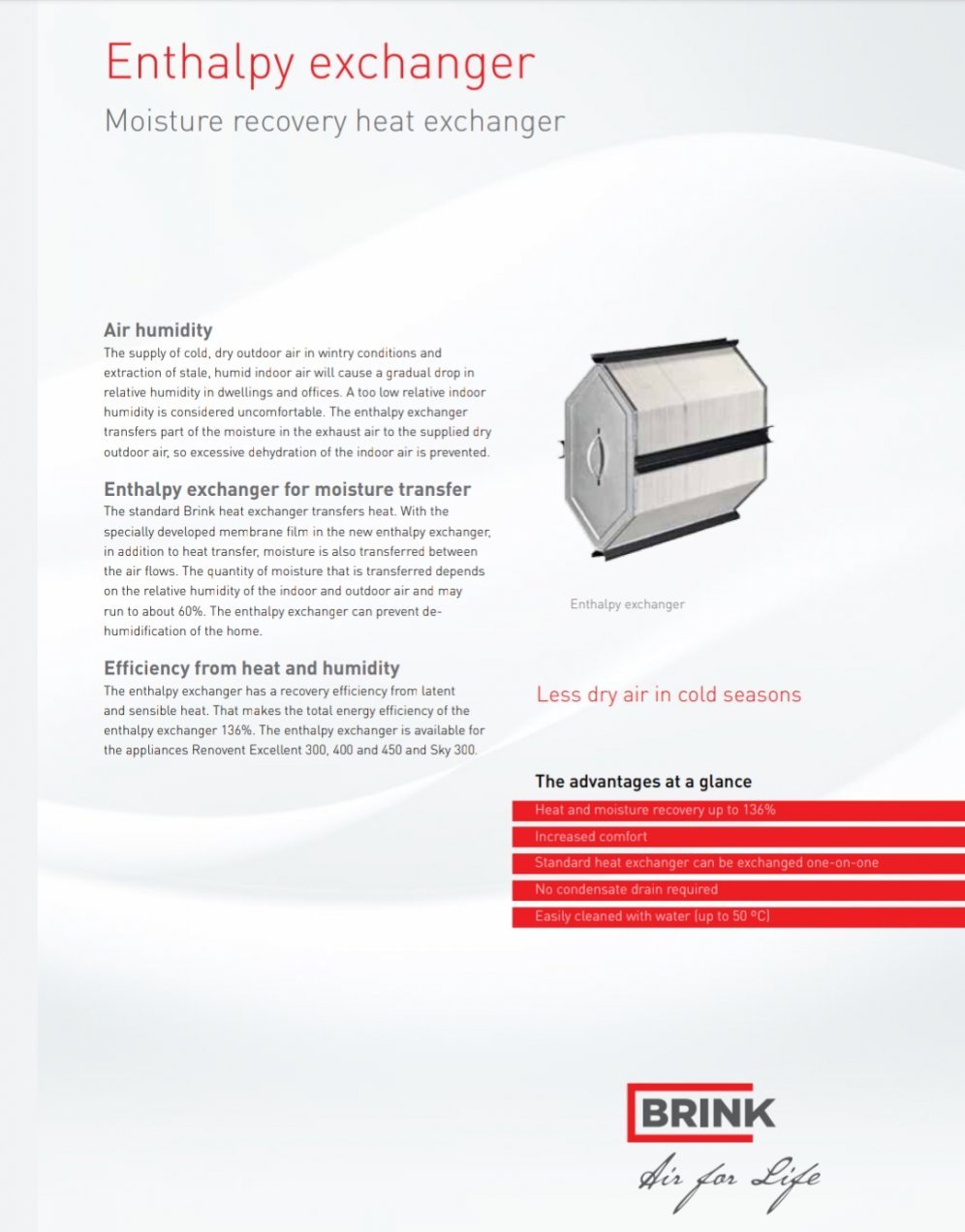 То връща част от влагата зимата вътре в помещенията, за да не се пресушава въздуха. А иначе има сензор за влага, който задейства машината при необходимост, мисля  с тези модели от брошурата работи, знам, че става за нашия Brink Renovent Sky 200 plus.