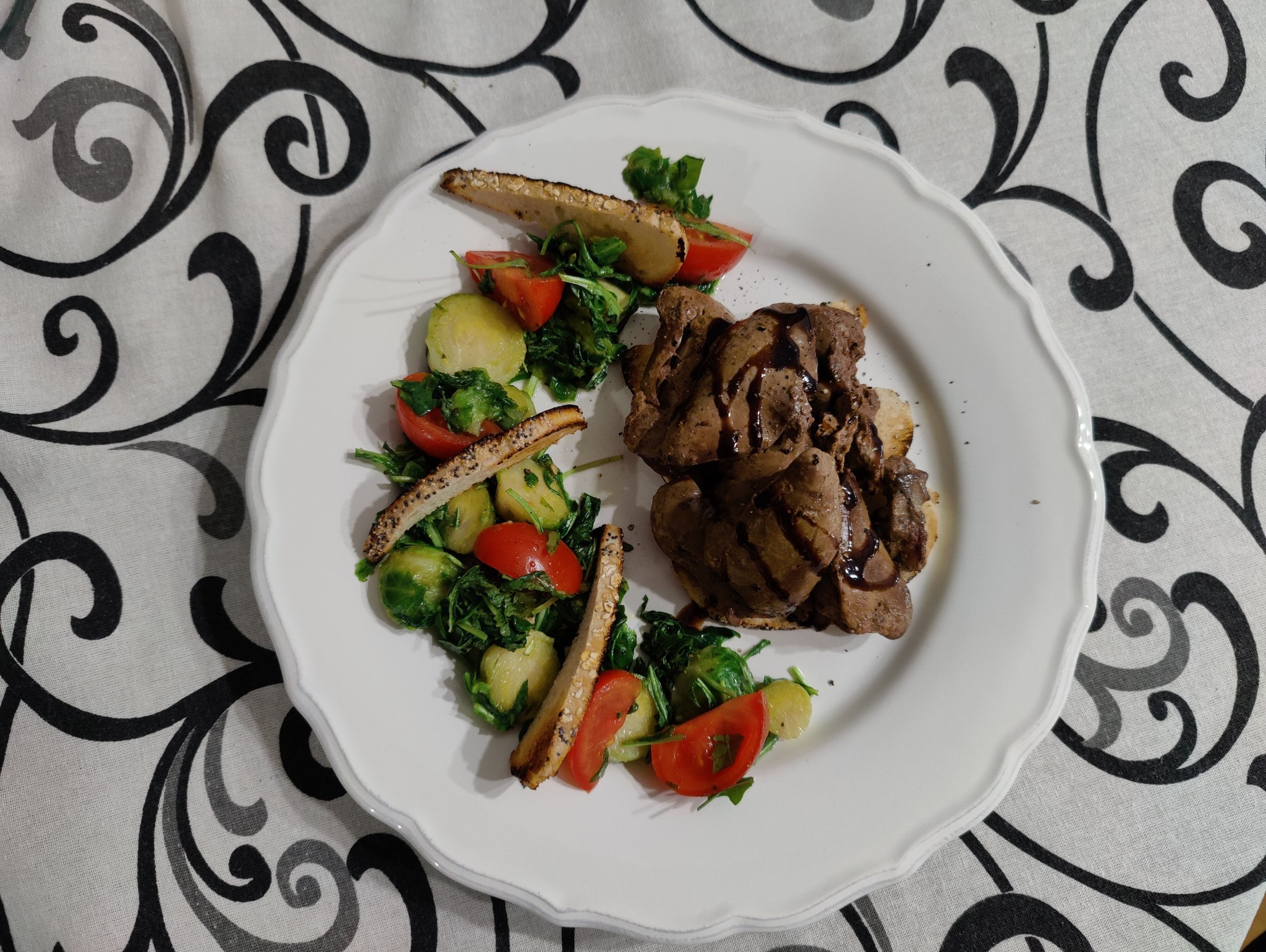) с мус козе сирене, карамелизирана круша и запечени натрошени лешници