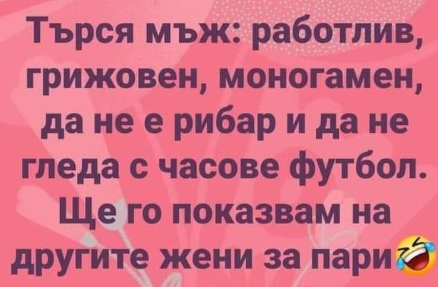 Мъж цяла седмица се готви да гледа бокс - купува бира и мезета, в деня на мача моли шефа да го пусне по-рано, прибира се, сяда удобно, сипва си бира, отпива и... нокаут в десетата секунда. Гледа бесен с отворена уста, зад него се обажда жена му: