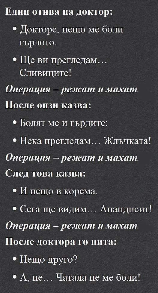 - Петров, как не те е срам! Три години жени от девети микрорайон идват тук да правят аборти от теб, а вкъщи не можеш да направиш дете!