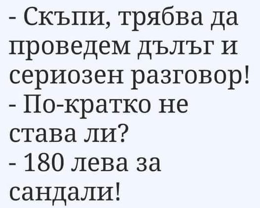 – Ами вчера, както си се разхождах, изневиделица се появи една мадама със ски, започна да се съблича и да вика: „Вземи, каквото пожелаеш“.