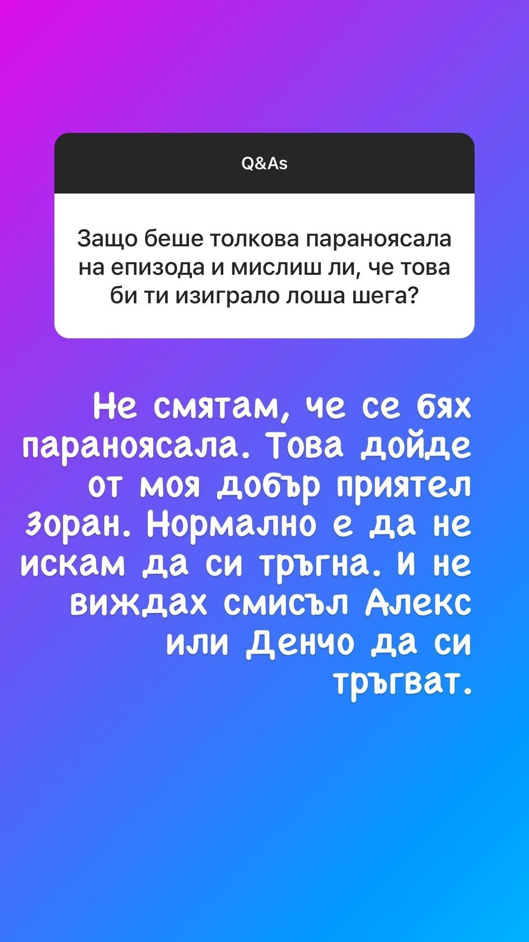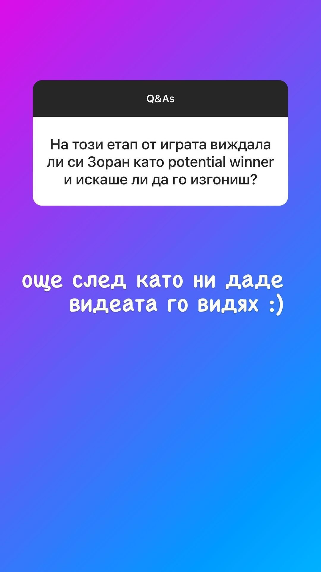 Според мен Зоран ще спечели финал с Карин и Ванко, но финал с Карин и трети човек като Денис и Бо, хич не съм убедена, че ще успее, защото и Денис, и Бо могат да смукнат един-два гласа от неговите сигурни на пръв поглед гласове. Та, аз не съм изненада, че може Зоран да се обърне срещу двамата, но пък не си обяснявам как не приема като заплаха Карин.