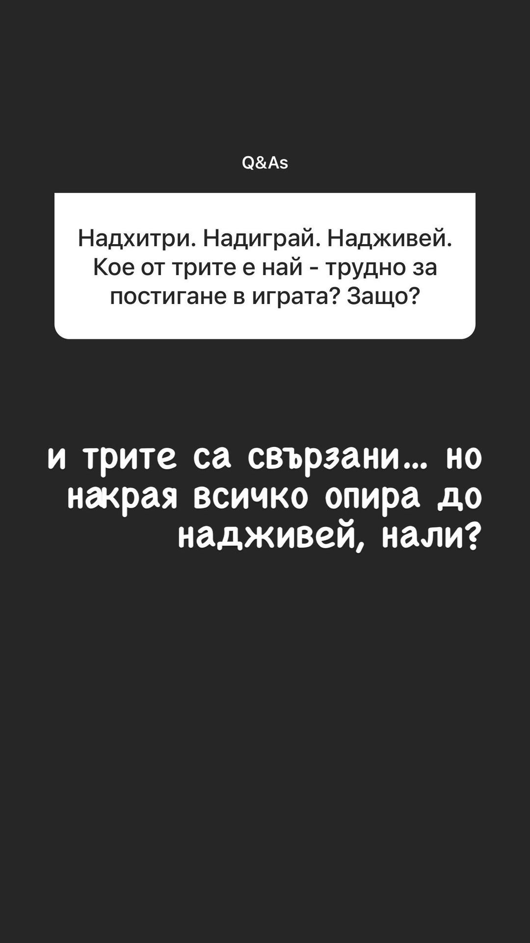 Довечера мисля, че играта е повече като за Ганка, въпреки че и Алекс проявява доста търпение в игрите. Ще видим. Която и да спечели, ще се радвам, но ми се ще да е Ганка и така гласувах.