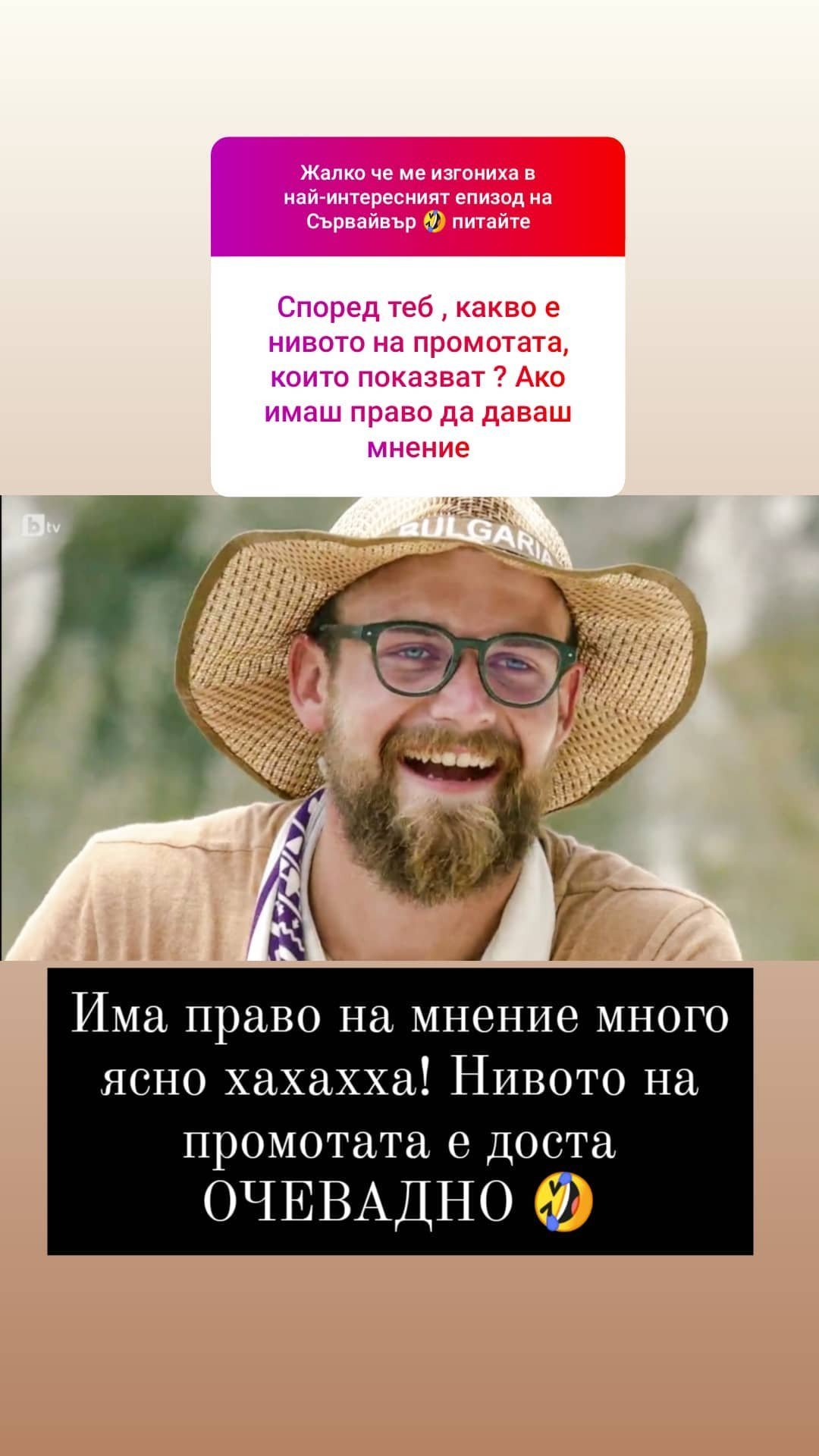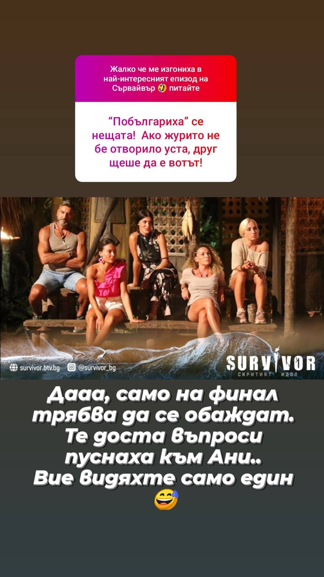 Зоран ме загуби с предателството си. Да, Сървайвър е и такава игра, но когато го правиш по такъв начин е долно и трупаш само негативи. И Ваня го каза, не се прави по този начин... Съжалявам, Зоране, но се наигра... Няма да е незаслужено да спечелиш, защото направи сезона цветен и запомнящ се, но у мен ще остане голяма горчилка.