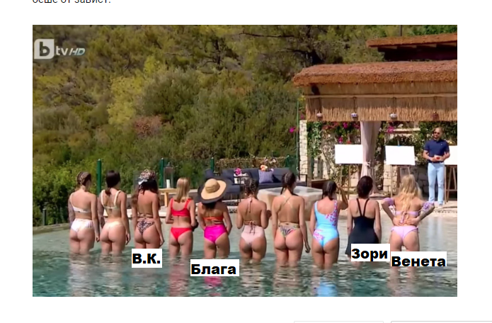 Здравейте  в чужбина съм и гледам предаването на различни платформи. Интересно ми е развитието в поведението на участничките и дали моите фаворитки ще бъдат такива до края. Вчера не можах да разбера защо Виктория се нарече маман пред Благовеста и то два пъти. Поне на мене ми е познат в друг смисъл.   По нататък ергенът в разговор с Гери беше изненадан от това, че е имало конфликт при дамите. Още повече, че самият той съдейства за това и като че ли се наслаждава. Не случайно бяха оставени Саша и Виктория.