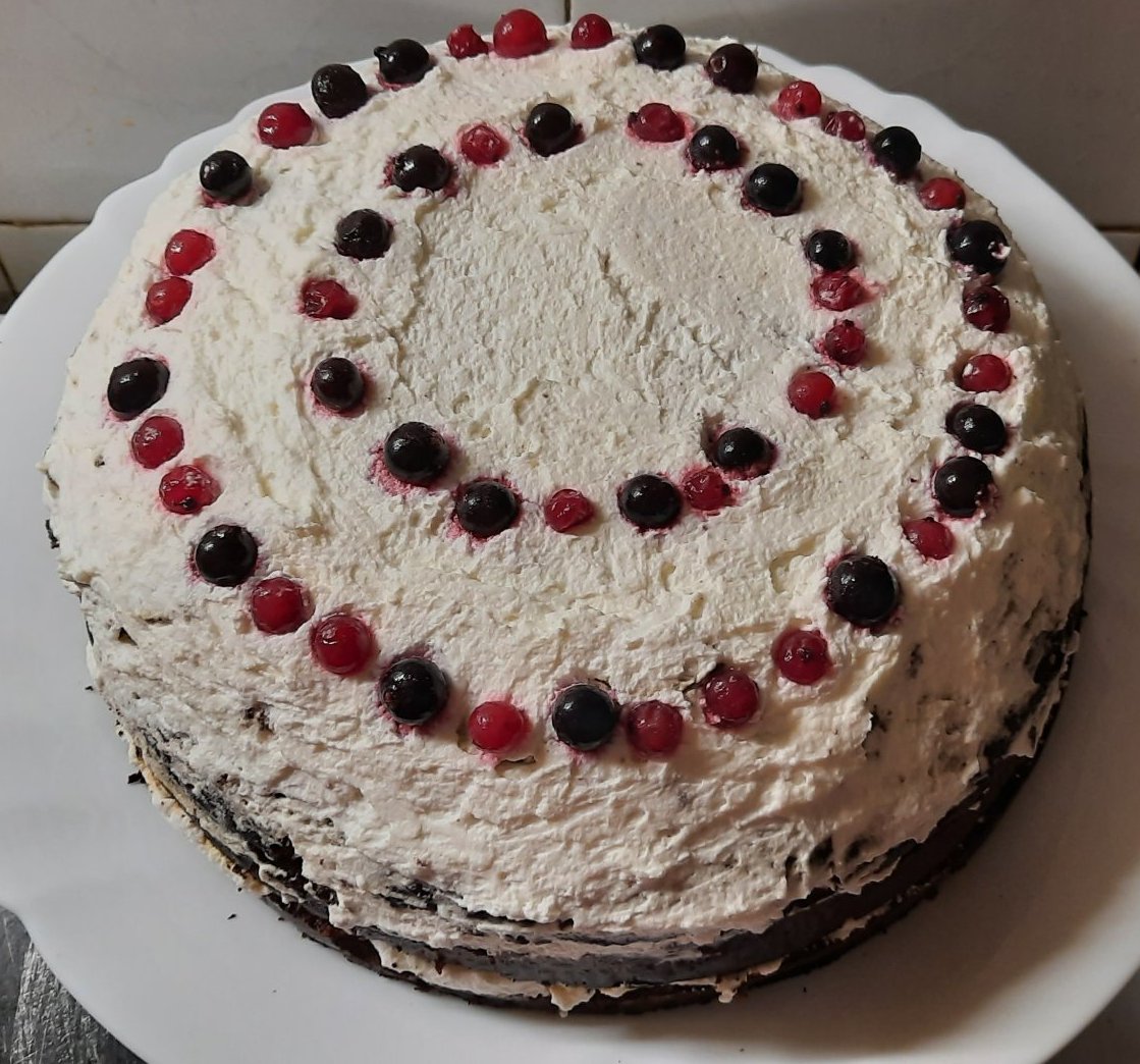 Ядох "Шоко лава торта"... 😛😍😜 С неподсладена сметана 36%, с малко орехи в сместа. Иначе като продукти я направих като в оригиналната рецепта на Йоли за шоколадови лави, НО увеличих яйцата от 4 на 10 бр, шоколада от 200 на 400 гр, намалих малко маслото, добавих орехи и пакетче бакпулвер. Захарта ми беше кафява (защото само такава купуваме, че бялата ни е като отрова- не само за мен), запазих количествата на брашно и кафява захар /не ги увеличих, защото реших, че няма нужда да е по-сладко, а и от яйцата стяга достатъчно и без да добавям още брашно/. Сиропирах с разредено с вода прясно мляко, гарнирах с разбитата сметана и отгоре малко горски плодове. Мисля, че се получи много приятна торта, която не е много далеч от режима, 140 гр кафява захар и 70 гр брашно има в цялата торта.