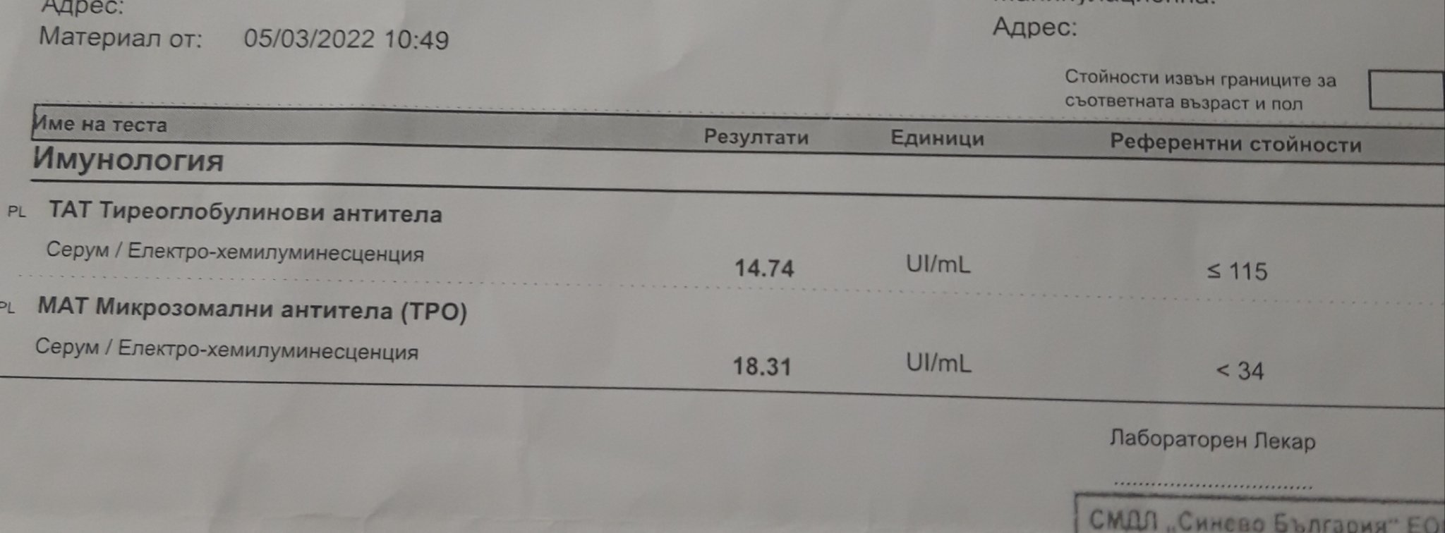 Изследваха и щитовидна. Там нещата са в граници, според доктора няма проблем с нея. Сега според мен стойностите не са идеални, като чета форума, но трети ендо ми казва, че са ок.