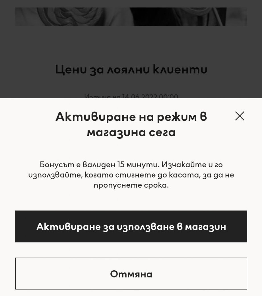 Цените за продуктите за лоялни клиенти във физически магазин трябва допълнитено да се активират от този бутон и веднъж активирани, важат 15 мин