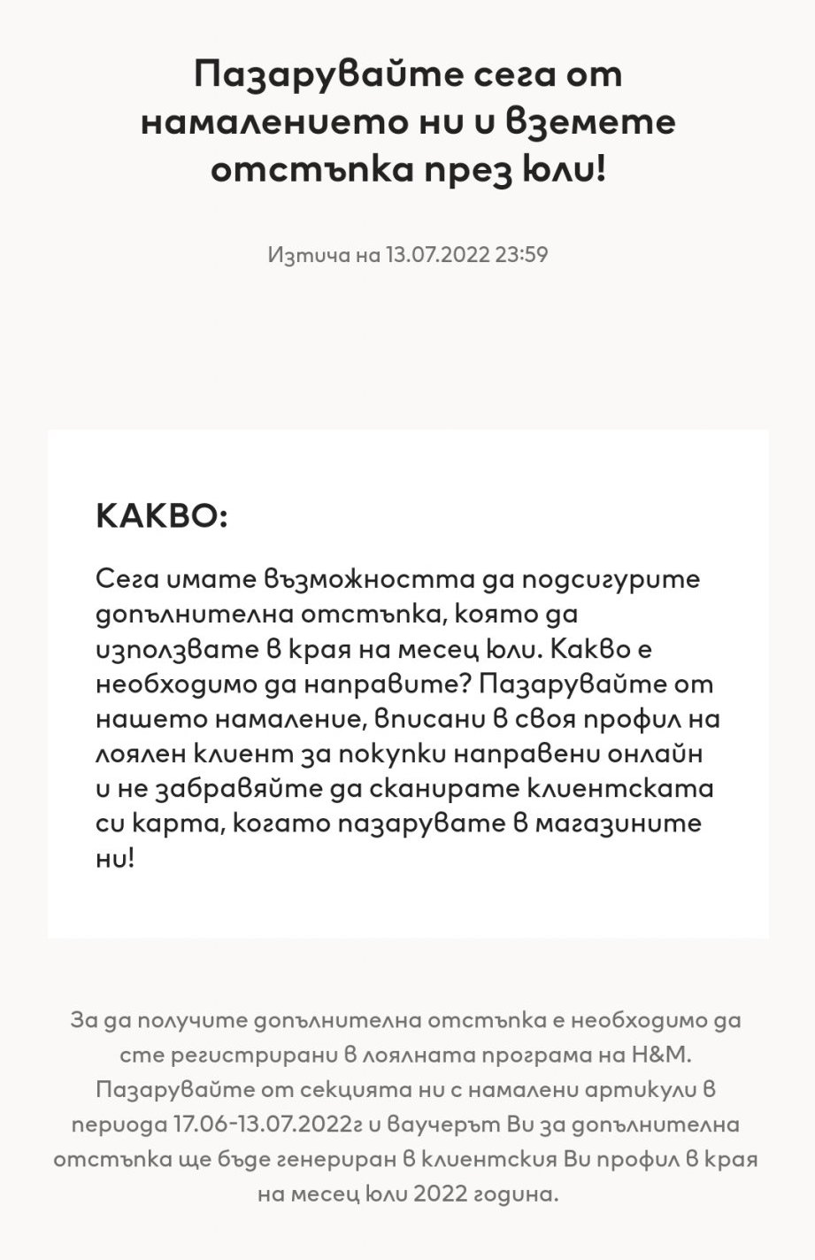 При връщане на дрехи в магазини на H&M се приемат всички видове дрехи, с изключение на бельо и обувки, независимо от марката и състоянието им. Закупена дреха с талон може да бъде заменена само за същата, но в различен размер или цвят. Талонът за отстъпка е валиден до 30 август на текущата година, а за дрехи, върнати до края на юли, се издава талон със срок до 31 декември. Връщането е безплатно за членове на програмата за лоялни клиенти. За да върнете дрехи в магазини на H&M, клиентите трябва да представят чисти дрехи без обувки и аксесоари. Домашен текстил също може да бъде върнат. Има ограничение от две торбички на човек на ден, с размери като тези на торбите от Kaufland или Billa.