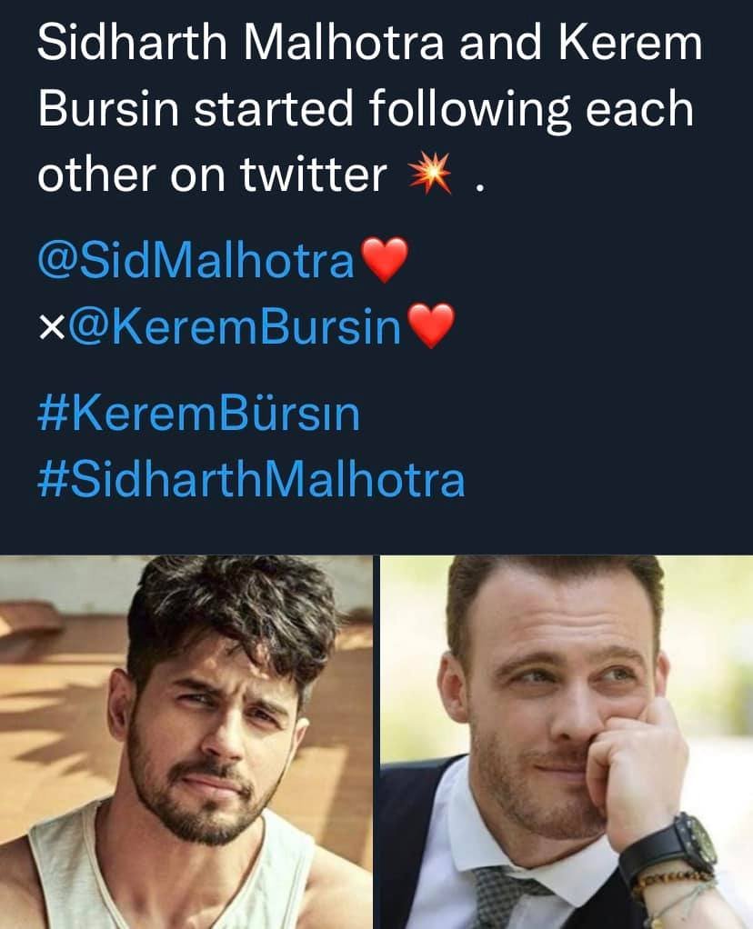 Bell И малко новини. /набързо ползвам лаптопа, но от утре ще съм на линия/ Керем и този индийски актьор /Сидхарт Малхорта/, който в момента е в Истанбул са започнали да се следват в ТТ. /изобщо не зная кой е, но има 18, 5 млн. последователи/ Фантазията на феновете се развихря и вече ги спрягат в международен проект.