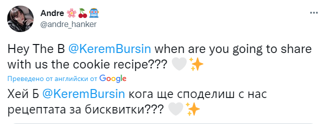 Тази фенка иска рецептата за бисквитките, които Керем приготвя.
