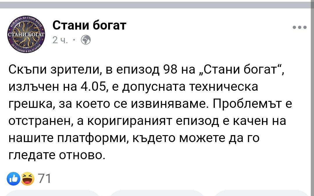 От "Стани богат" се извиняват за вчера: