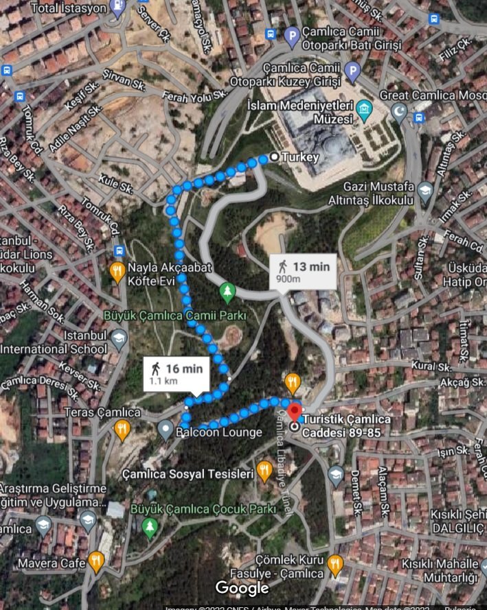 Може и аз да съм ви подвела леко за "приятната разходка" на Чамлъджа между джамията и стария парк на хълма. Да, разстоянието не е дълго, но има сериозна денивелация, особено във втората часта на маршрута. Ние минахме по пътеката, която съм маркирала в синьо на картата. Има алеи, гледки, пейки, детски площадки и накрая сериозен баир. Обаче е оправено и кал няма. Та това е, което вероятно съм препоръчала  Simple Smile