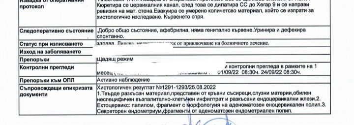 По ред причини на 23.08.22 ми направиха абразио. Процедурата мина нормално. Кървенето беше доста в първите 3-4 дни, после понамаля, но все още не е спряло. Междувременно провеждам и лечение на цистит (за  който изобщо не подозирах че имам) с Цистостоп СР, но откакто го пия ми се обостриха болките от цистита. Припокриват се с дискомфорта от абразиото.
